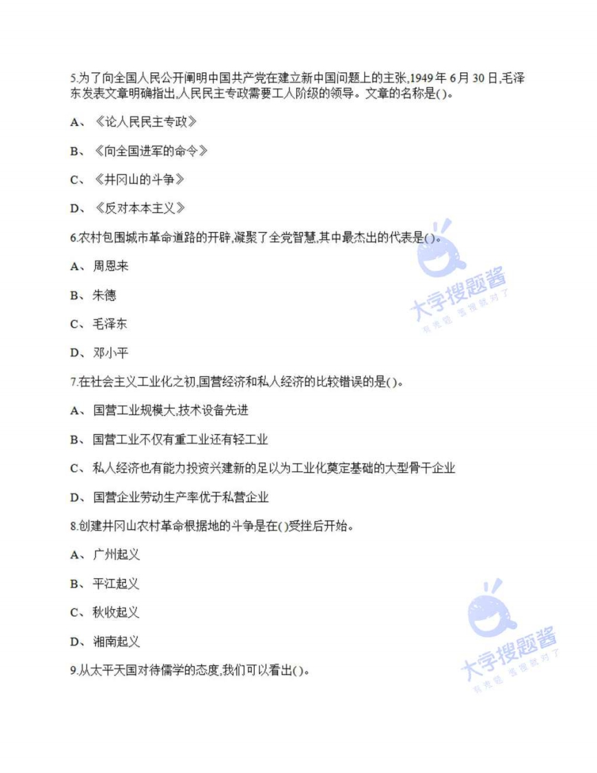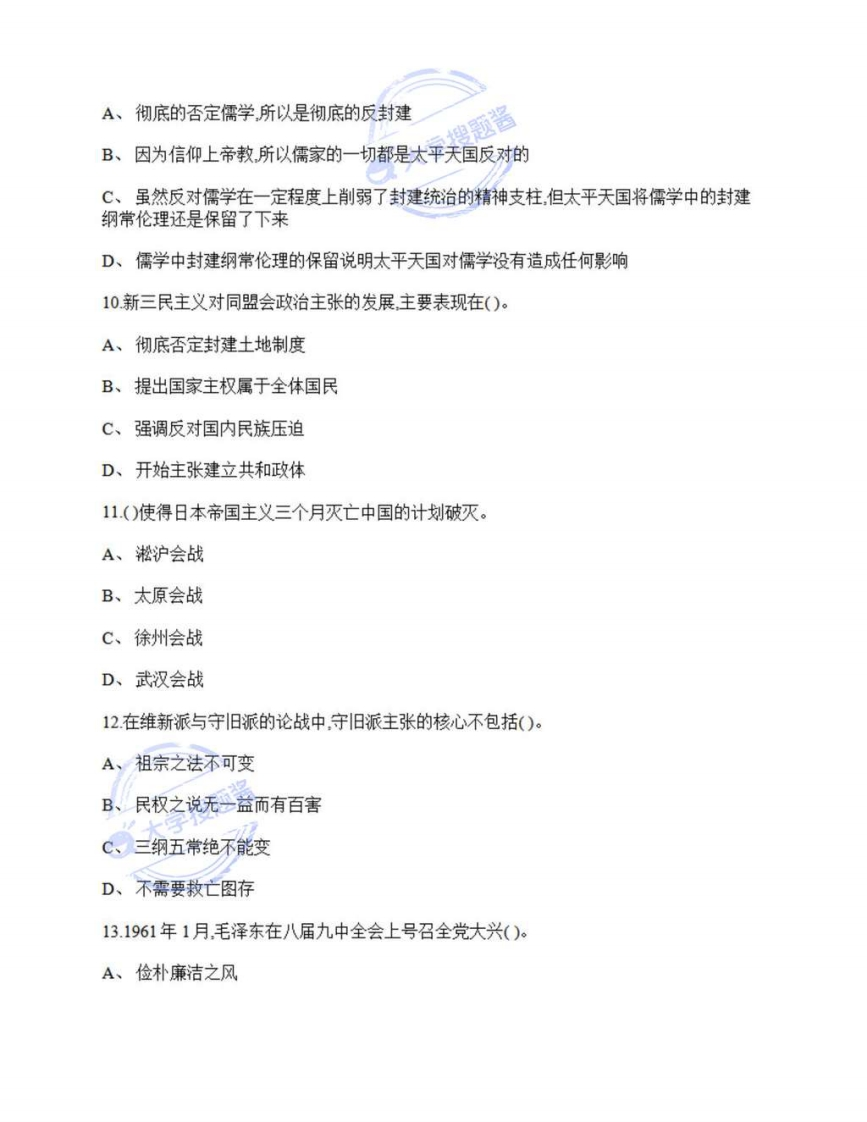 中国人民大学《中国近现代史纲要》2022-2023年第一学期期未试卷一、单项选择题1.下列关于新文化运动的叙述,正确的是()。A、具有较为广泛的群众基础B、强调建设资产阶级民主政权C、在文学革命方面取得突出成就D、彻底否定中国全部传统大字搜题酱2.1903年邹容写的中国近代史上第一部宣传革命和资产阶级共和国思想的著作是()。A、《猛回头》B、《警世钟》C、《革命军》D、《驳康有为论革命书》3.“变者天下之公理也”,“能变则全不变则亡”这些言论属于()的观点。A、洋务派B、维新派C、保守派D、顽固派牌题酱4继兴中会之后资产阶级革命团体在各地陆续成立。其中,由黄兴为会长的是()。了A、华兴会B、光复会C、岳王会D、科学补习所