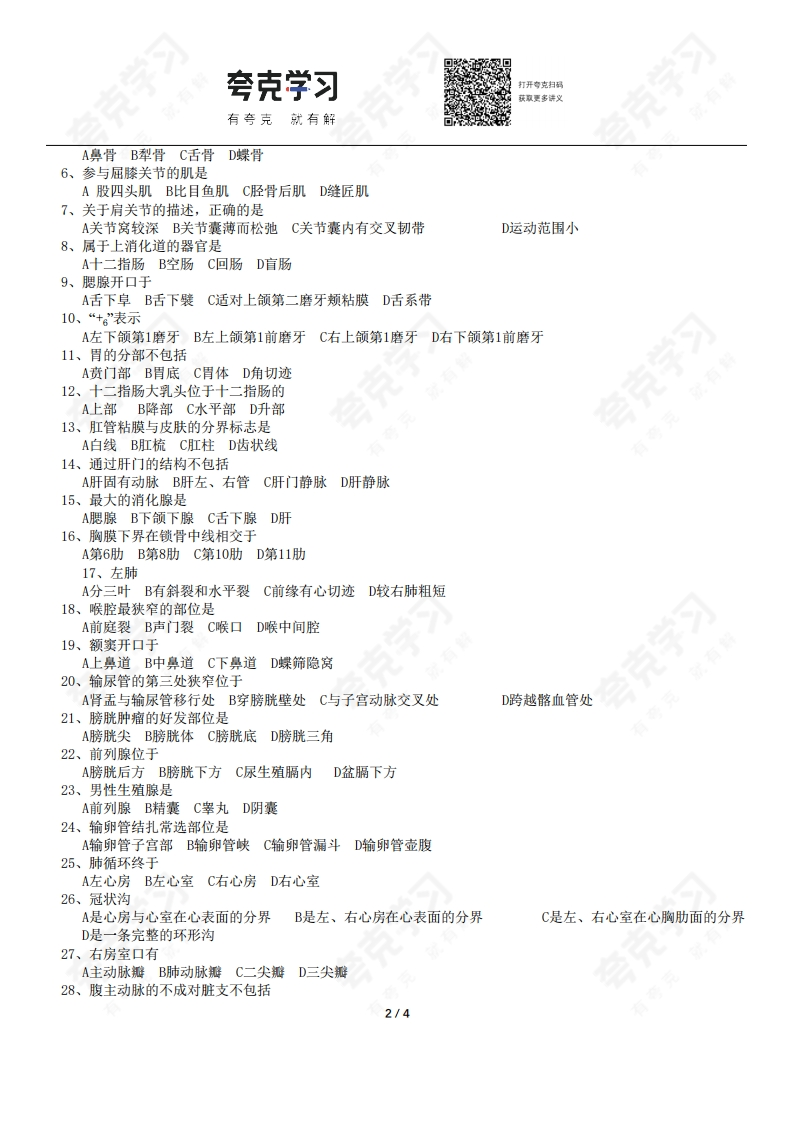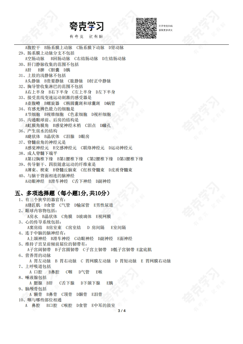 F▣夸克学习打开专克扫码质双更多禁义有夸克就有解中国药科大学《人体解剖学》2020-2021第一学期期末考试试卷一、名词解释(每题3分,共15分)1、胸骨角2、咽峡3、膀胱三角4、腹股沟管5、神经核二、填空题(每空1分,共15分)1、膈上有三个孔,由后向前依次是2、右主支气管的特点是」3、脑干由三部分组成。4、盲肠和结肠的三种特征性结构是、5、右心房有三个入口,即、、三、是非题(每小题1分,共10分)1、骨髓都具有造血功能。2、左侧颏舌肌瘫痪,伸舌时舌尖偏向右侧。3、三角肌从前、外、后三面包围肩关节。4、肺动脉的血液为静脉血。5、颈曲、腰曲凸向前。6、脊髓灰质前角含有运动神经元的胞体。克学7、胆汁由胆囊合成后经胆总管排入十二指肠。8、视锥细胞具有感受弱光和辨色能力。9、以解剖学姿势为准,人在倒立时,近足者为上,近头者为下10、肾区位于竖脊肌外侧缘与第11肋的夹角内。四、单项选择题(每小题1分,共40分)1、将人体纵切成左右两部分的切面是A矢状面B冠状面C水平面D横切面2、关于胸骨角的描述正确的是A平对第2肋B是两肋弓的夹角C为胸骨体与剑突形成的结构D凸向内面3、滑膜关节的基本结构包括A关节面、关节囊、关节内韧带B关节面、关节囊、关节内软骨C关节面、关节囊、关节腔D关节面、关节腔、关节盘4、不构成骨盆界线的结构是含克学A骶骨岬B弓状线C耻骨梳D耻骨联合下缘5、属于脑顿骨的是1/4