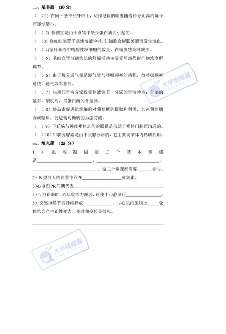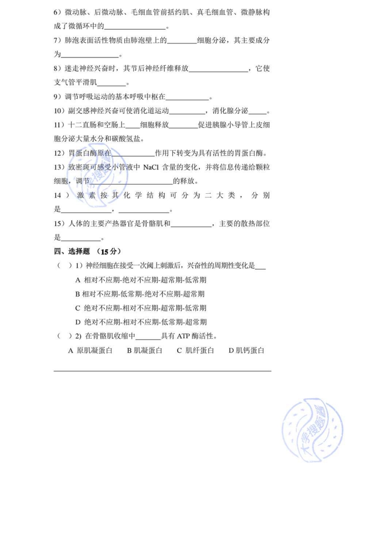 中国药科大学中药学院人体解剖生理学期末试卷_738158猴哥6个月前更新关注私信0.40MB5页01.2W+4864中国药科大学中药学院人体解剖生理学期末试卷_738158此内容为付费资源,请付费后查看10积分年度会员免费月享会员免费登录购买付费资源已售 974 第1页 / 共5页 第2页 / 共5页 第3页 / 共5页 试读已结束,还剩2页,您可下载完整版后进行离线阅读 © 版权声明文章版权归作者所有,未经允许请勿转载。THE END《中国药科大学》期中期末历年真题期末试卷 文本预览 中国药科大学人体解剖生理学试卷A专业班级学号姓名题号二三四五总分分数评卷人搜题酱名词解释(10分)1)凝集素2)肺牵张反射3)阅强度4)应急反应5)胃肠激素大学搜题酱 查看更多 收起部分 喜欢就支持一下吧点赞4864赞赏 分享QQ空间微博QQ好友海报分享复制链接收藏
