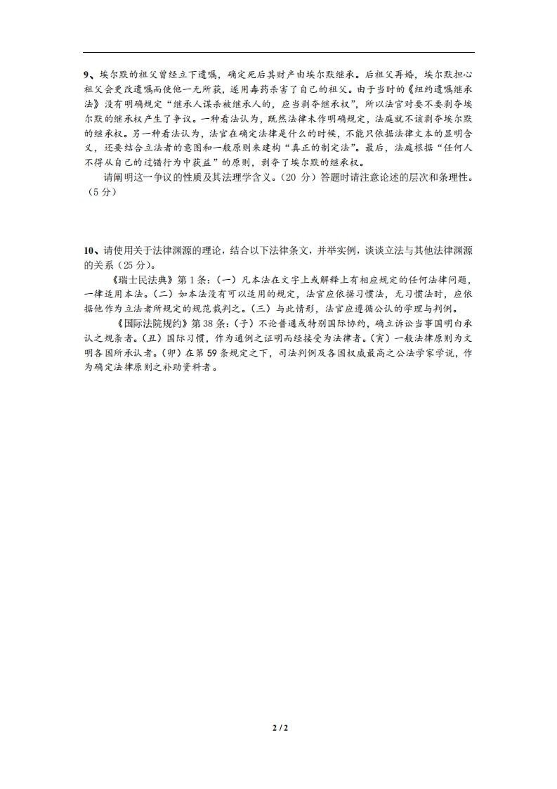 中国政法大学期末考试真趣系列中国政法大学2020-2021学年第二学期法理学原理(301010022)期末考试试题考试对象:本科生本试卷满分为100分,占课程总成绩的100%.答题要求:1、请将答業纯一写在答题纸上,不按要求答题的,青任考生自负。2、答题纸与试卷一同交回,否则的情扣分。3、本课程为开卷考试,考生可以携带任何书面资料进入考场,但不得使用手机、电脑及其他电子资料,不得交头接耳,需独立完成考试。一、必答题(本题共2题,每题25分,共50分,答案请写在答题纸上)。1、法概念理论的基本争议点是什么?请阐明其主要内容。2、有人说,法学方法论指的是法教义学的方法论,它对应于实证主义的法概论立场。你如何评价这个观点?二、选答题(本题共8题,考生请任选2题作签,每题25分,共50分,答案请写在答题纸上)。3、请以古典(希腊和古罗马)自然法思想为原理分析中国古代法律思想中的自然思想(25分)。4、请阐述法对自由限制的两个主要法学视角(25分)。5、请论述权利意志论和利益论的主要观点(10分),并对这两种权利理论分别做简单评价(15分).6、请阐明形式法治理论的主要内容(10分),并从此角度出发试述对中国特色社会主义法治的理解(15分)。7、请简要阐述法学方法的主要特征(25分)。8、试论述法律解释之适用规则的发展简史(10分)、作用(5分)及主要内容(10分)。1/2