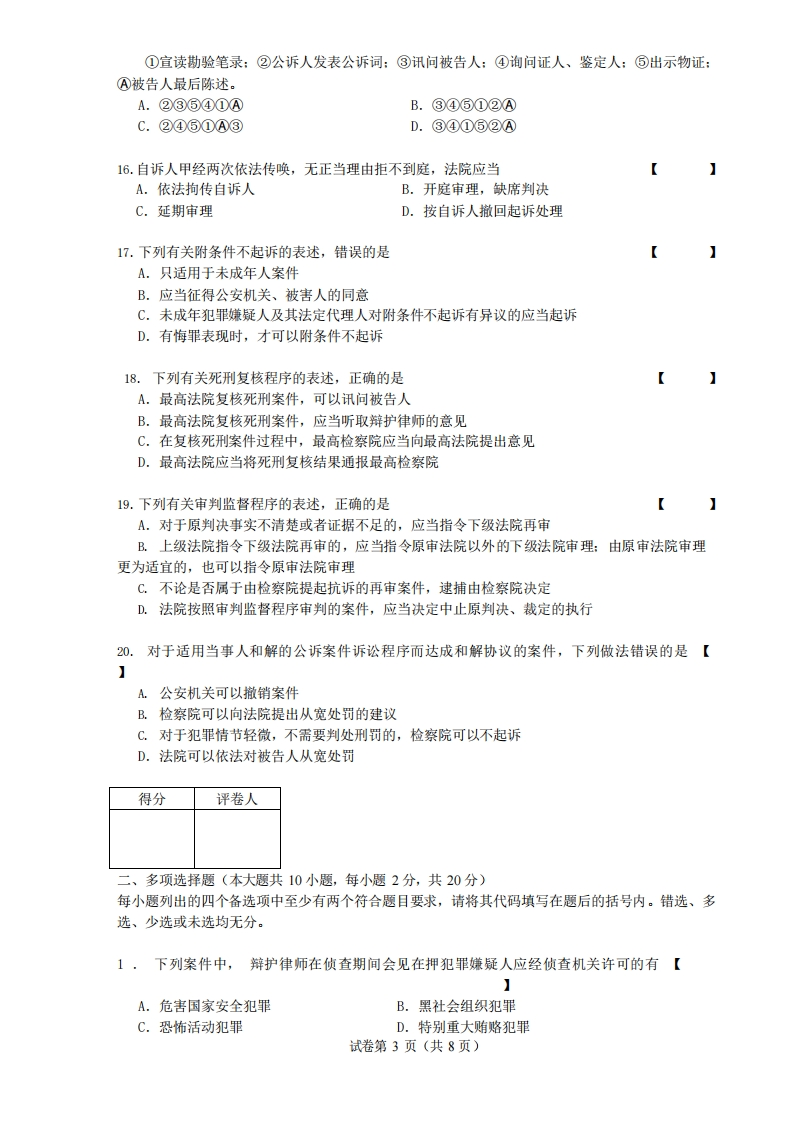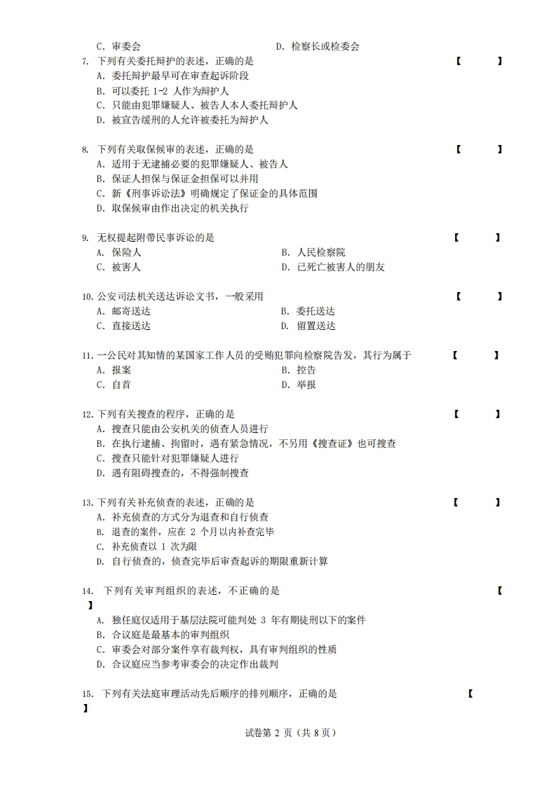 中国政法大学试卷2020一2021学年第二学期课程刑事诉讼法学专业年级本试卷共8页,满分100分:考试时间:180分钟:考试方式:闭卷密题号四五七总分核分人线202015161514100内题满分不得分题得分评卷人一、单项选择题(本大题共20小题,每小题1分,共20分)每小题列出的四个备选项中只有一个最符合题目要求,请将其代码填写在题后的括号内。错选、多选或未选均无分。1.纠问式诉讼最主要的特点是A.刑讯逼供合法化B.不告不理C.诉审分离D.当事人双方诉讼地位平等2.刑事诉讼中的中心人物是】A.法官B.检察官C.律师D.犯罪嫌疑人,被告人3.以下不属于中院管辖的案件是】A.危害国家安全案件B.恐怖活动案件C.可能判处无期以上的普通刑事案件D.外国人犯罪的刑事案件4.我国刑诉法未赋子犯罪嫌疑人、被告人哪项权利?A.申请回避权B.沉默权C.最后陈述权D.通信权5.拘传持续的时间最长不得超过A.48小时B.36小时C.24小时D.12小时6.·当事人对出庭的检察人员提出回避申请的,该检察人员的回避由谁决定?】A.审判长B.合议庭试卷第1页(共8页)