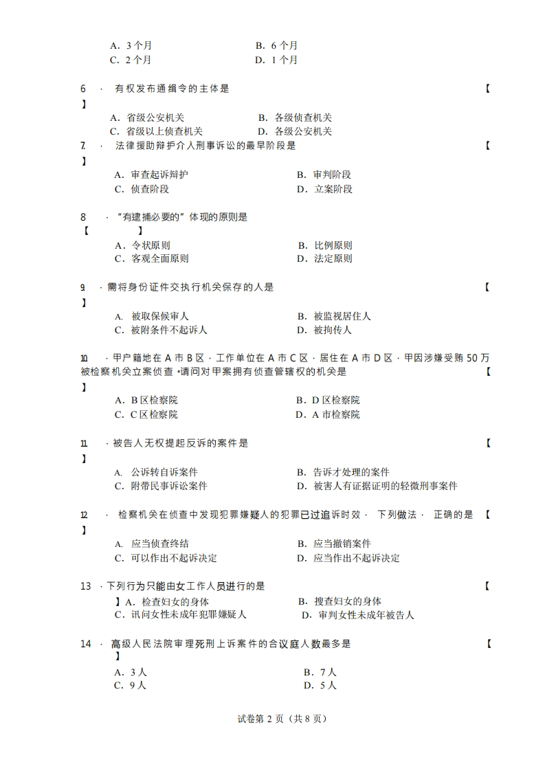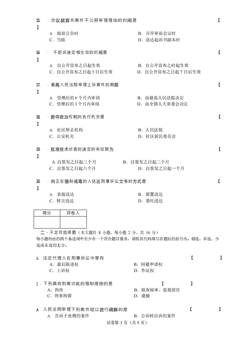 中国政法大学试卷2022一2023学年第二学期课程刑事诉讼法学专业年级本试卷共8页·满分100分;考试时间:180分钟;考试方式:闭卷密封题号四五七总分核分人线内不题满分201615201019100要答题得分得分评卷人一、单项选择题(本大题共20小题,每小题1分,共20分)每小题列出的四个备选项中只有一个最符合题目要求,请将其代码填写在题后的括号内。错选、多选或未选均无分。我国刑事诉讼法立法的直接目的是A.惩罚犯罪B.保障刑法的正确实施C.保障人权D.保障刑法的正确实施,惩罚犯罪、保护人民2·诉讼代理人在刑事诉讼中享有】A.最后陈述权B.回避申请权C.上诉权D.申诉权3.·扭送制度所体现的原则是A.依靠群众原则B.严格遵守法定程序原则C.迅速及时原则D.效益原则·下列由人民法院执行的刑罚是A.管制B.社区矫正C.没收财产D.拘役·违法所得没收程序的公告期是试卷第1页(共8页)
