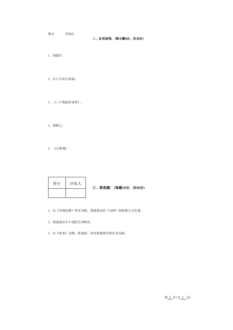 中南财经政法高校2023-2023学年第一学期期末考试试卷课程名称:《中国现当代文学(1)》()卷课程代号:12047010考试形式:闭卷、笔试运用对象:汉语言文学专业2023级本科题号二三四五六七总分总分人分值得分得分评阅人一、填空题:(每空1分,共20分)1、)年1月和()先后在()月,胡适和()上发表了题为)和()的两篇文章,标记着五四文学革命的起先。2、()是中国现代文学史上第一个新文学社团,它成立的时间是()年1月,地点在(),发起人有郑振铎、0、()、()等12人。它的主要阵地有革新后的(),它的现实主义文学思想可以用(“”)来加以概括。3、早期象征诗派的代表诗人是(4、早期无产阶级革命诗歌的代表诗人及诗集是()的(5、中国现代文学史上第一部白话诗集是(6、落花生是小说家()的笔名,其早期浪漫传奇小说的代表作品是