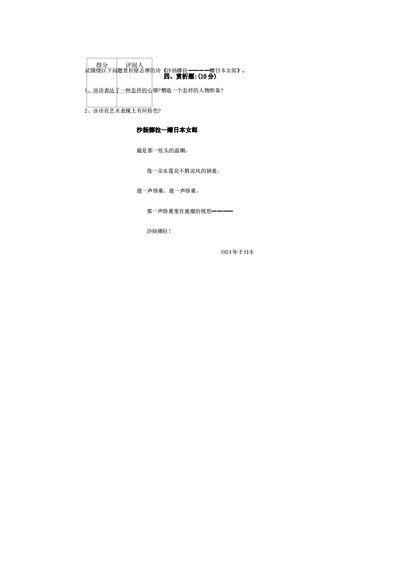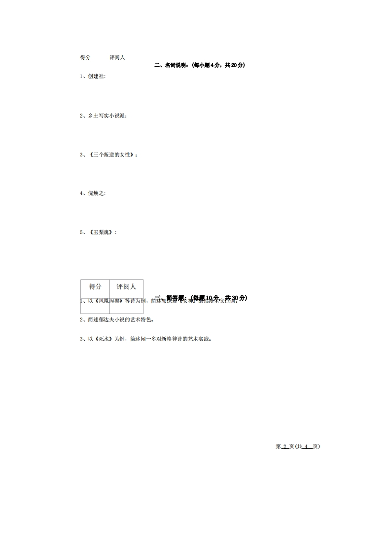 中南财经政法高校2023-2023学年第一学期期末考试试卷课程名称:《中国现当代文学(1)》(A)卷课程代号:12047010考试形式:闭卷、笔试运用对象:汉语言文学专业2023级本科题号二三四五六七总分总分人分值得分得分评阅人2、()是中国现高务舞弧新文学社团,它成立的时间是(年1月,地点在(),发起人有郑振铎、0、()、()等12人。它的1、()年1月和()先后在()月,胡适和()上发表了题为(主要阵地有革新后的(),它的现实主义文学思想可以用(“”)来加以概括。)和()的两篇文章,标记着五四文学革命的起先。3、早期象征诗派的代表诗人是()。4、早期无产阶级革命诗歌的代表诗人及诗集是()的(5、中国现代文学史上第一部白话诗集是()。6、落花生是小说家()的笔名,其早期浪漫传奇小说的代表作品是(