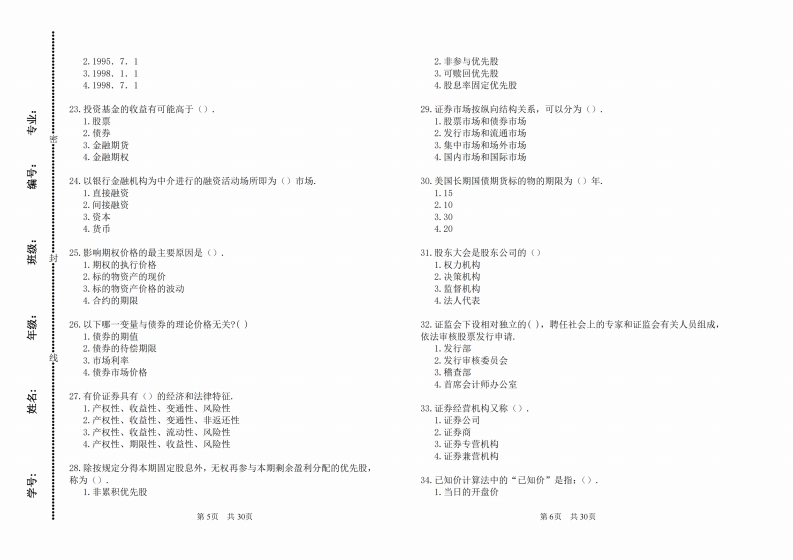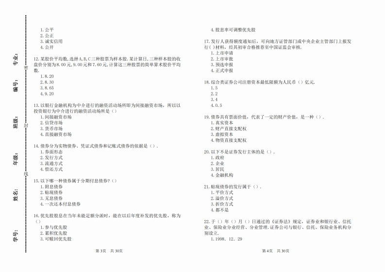 中南财经政法大学2022-2023学年第一学期期末考试2公平原则3.公正原则证券投资学(21级选修班)试卷4.诚实信用原则考试方式:闭卷考试时问:150分钟卷面总分:100分6以下球种证券一般不在场外交易市场交易?()斜第一部分:单选题1.债券请在下列题目中选择一个最适合的答案,每圈0.5分2.新发行的各类证券密3.不符合证券交易所上市标准的证泰1.经纪类证券公司只能从事〔)4.封闭型基金的受益凭证1.证券经纪业务碟2.证券自营业务7.以下不是证苏交易所理事会的职责的是(),3.证券承销业务1.执行会员大会的决贸4,证券经纪业务、证券自营业务2.选举和罢免会员理事3.制定、修政证券交易所的业务规则2.以下哪种机构不是证券发行市场上的中介机构?()4审定总经理提出的工作计划1.证券承销商2.会计审计机构&.根器《中国证监会股票发行核准程序》的规定,股份有限公可的发行中请3.律师事务所文件应由《)推荐并向中国证监会中报4.证券自营商1.发行公司2.证监会的当地派出机构3.1975年10月20日率先开办政府国民抵押协会的抵押债券期货标志着利率3.主承销商期货的正式产生的交易所是()4.承销团1.芝加哥商品交易所2.芝加哥期货交易所9.决定情券票面利率时无须考虑()·3.国际货币市场1.投资者的接受程度4.美国堪萨斯农产品交易所2.债券的信用级别3.利息的支付方式和计息方式4.证券业从业人员获得从业资格证书后超过()而未在证券专业岗位就职,4.股票市场的平均价格水平资格证书白动失效,取得资格证书的人员连续未从事证券业务活动达(),若要重新成为证季从业人员,需要重新申请10.优先认股权的有效期一般为(),1.8个月,24个月1.2-10年2.24个月,18个月2.3-10年3.18个月,18个月3.两周到0天4.24个月,24个月4.两周到60天5.()是对证券监督管理部门的要求。11.证券监督管理机关和证券争议处理机关在履行职责时,如果没有法律依孙1.公开原则据或法律规定不明,应当依据()原则解释法律和处理问题.第1页共30面第2页共30页