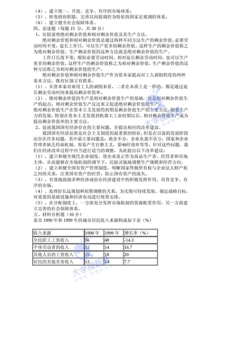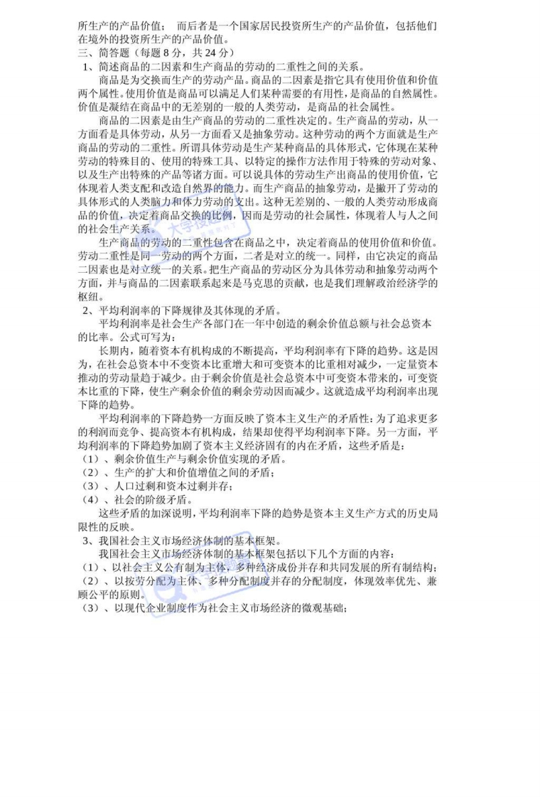 政治经济学期末考试试卷答案作者:Jessie已被分享19次复制链接一、填空题(每题1分,共10分)1、政治经济学的研究对象是(生产关系)。2、作为价值实体的劳动是(抽象劳动)3、准确反映资本家对雇佣工人剥削程度的指标是(剩余价值率)。4、级差地租产生的原因是(垄断经营有限的较优等土地);绝对地租产生的原因是(土地私有权)的垄断。5、社会总资本再生产的核心是(实现问题,即社会总产品的各个部分的价值补偿和物质补偿问题)。6、在股份制中,实行一股一票,体现的是(出资者)主权:在合作制中,实行一人一票,体现的是(劳动者)主权。7、混合所有制经济的性质是由其(处于主体或主导地位的所有制形式决定)。8、现代企业制度的基本形式是(公司制企亚)二、名词解释(每题5分,共20分)1、不变资本和可变资本在剩余价值的生产过程中,以生产资料的形式存在的那部分资本,在生产过程中其价值被转移到新产品中去,不改变原有的价值量,因而被称为不变资本。另一部分用来购买劳动力的资本是可变资本。劳动力在生产过程中创造新价值,而且能够创造出大于劳动力价值的价值,即剩余价值。由于以劳动力形式存在的资本会发生价值增值,所以被称为可变资本。2、资本积聚和资本集中资本积聚和资本集中是单个资本增大的两种基本方式。资本积聚是资本积累的直接结果,即个别资本通过剩余价值的资本化而增大其总额的一种方式。而资本集中则是由若干分散的小资本合并成大资本的过程。资本积累与资本集中的区别在于:(1)资本积聚以资本积累为基础,因而单个资本增大的同时,也使社会总资本增大:而资本集中是原有资本的重新组合,虽然使单个资本变大,但不能使社会总资本增大。(2)资本积聚的规模和速度最终受到原有资本积累速度和社会财富增长限制,因而其增长是缓慢的:而资本集中可以不受资本积累速度的限制,可以在较短时间有效资本合并为大资本,所以增大速度很快。3、经济增长与经济发展经济增长是一个国家一定时期总产量(包括商品和服务)和生产能力的增加。一般用国民生产总值或国内生产总产值的变动率来衡量。经济发展是指一个国家的经济发达程度,一般用人均收入水平来衡量。经济发展与经济增长相比包括的内容更丰富,它除了收入水平的变动,还涉及生产力水平、经济结构、市场范围等方面的变动。4、国内生产总值与国民生产总值国内生产总值是一国一年内生产的全部最终产品的价值总和。它是指国家境内投资的生产资源所生产的总产出量。而国民生产总值是一年内一国居民所拥有的投入要素所生产的最终产品的价值总和。这两个概念都是衡量一国一年内经济总量变动的指标,但二者的区别在于:前者是一个国家国土范围内的生产总量,其中包括外国投资者在一个国家的投资大学搜题酱