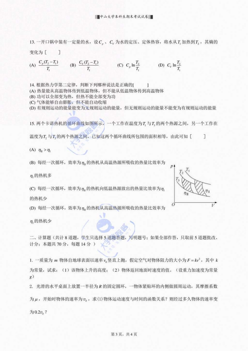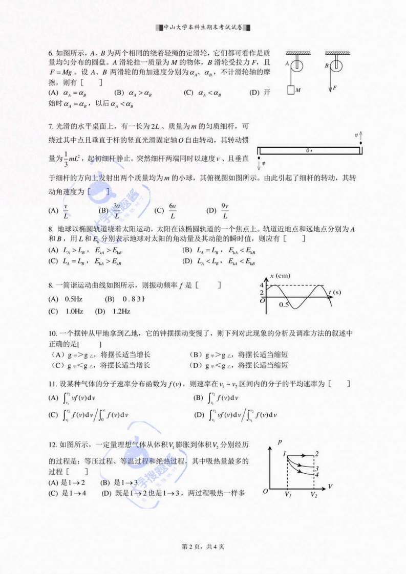 ■中山大学本科生期末考试试卷■中山大学本科生期末考试考试科目:《大学物理》(A卷)学年学期:2017学年第2学期姓名:学院/系:大气科学学院学号:考试方式:闭卷年级专业:考试时长:120分钟班别:任课老师:高扬警示《中山大学授予学士学位工作细则》第八条:“考试作弊者,不授予学士学位。”以下为试题区域,共2道大题,总分100分,考生请在答题纸上作答一、选择题(每题2分,共30分)1.如图所示,手提一根下端系着重物的轻弹簧,竖直向上作匀加速运动。当手突然停止运动的瞬间,物体将[】(A)向上作加速运动(B)向上作匀速运动(C)立即处于静止状态(①)在重力作用下向上作减速运动2.质点以速度y,=4+(S)沿x轴作直线运动,已知1=3s时质点位于x=9m处,则其运动方程为[(A)x=2(SI)(B)x)产+4SD(C)x=2+-12SD(D)x=+4+12SD333.关于曲线运动下列叙述不正确的是[(A)物体之所以做曲线运动,是由于物体受到垂直于速度方向的力(或者分力)的作用(B)物体只有受到一个方向不断改变的力,才可能作曲线运动(C)物体受到不平行于初速度方向的外力作用时,物体做曲线运动(D)曲线运动可以是一种匀变速曲线运动4.一质量为m=2kg的物体在水乎桌面上运动,物体与地面之间的摩擦系数为4=0.2,现施加给物体一水平作用力F=6+21(S,使物体从静止开始运动,在1=1s时的物体速度大小为】(取g=10m/s2)(A)3m/s(B)1.5m/s(C)7.5m/s(D)10m/s5.质量为m半径为R的1/4圆弧木槽,放置在光滑水平地面上。一质量为m的滑块由静止开始沿着光滑的木槽下滑,如图所示,则滑块离开木槽时,木槽的速度为[(A)2√RgB)√2Rg(C√Rg(D)第1页,共4页