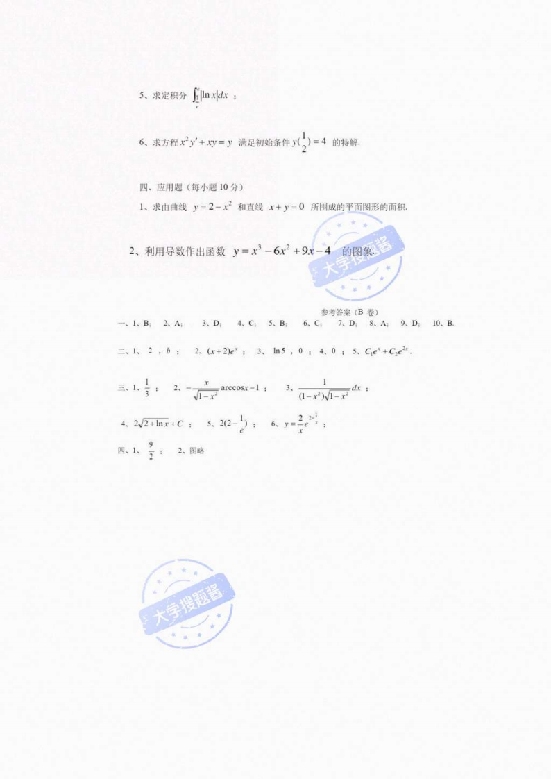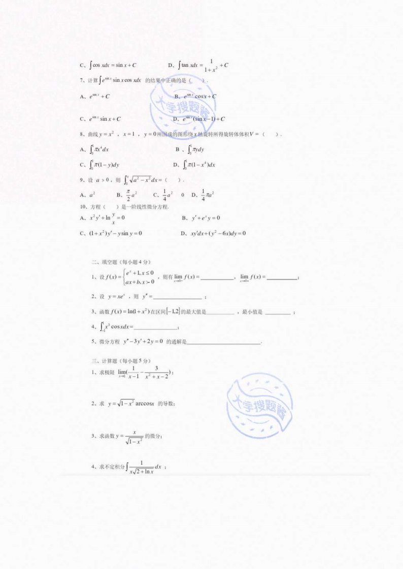 中山大学《高等数学》2018-2019学年第一学期期末试卷(满分100分)一、选择题(每小题3分)人函数y=2++中D的定义线是()A、(-2.-1)U0.+B、(-1.0U(0.+oC、(-1.0)∩(0,+o)D.l+¥★2、下列各式中,极限存在的是()·B、limarctan xD、lim2”=()A、eB、e2C、1D、e4、曲线y=x山r的平行于直线x-y+I=0的切线方程是(),A、y=xB、y=(lnr-1)x-I)C、y=x-1D、y=(x+D5、已知y=xsin3x,则dy=(),A.(-cos3x+3sin3x)duB、(sin3r+3rcos3r)drC、(cos3r+sin3.rdxD、(sin3x+xcos3x)dx6、下列等式成立的是()A、∫“d=1xe+CB、∫a'd=a'lnr+C+1大学搜题酱