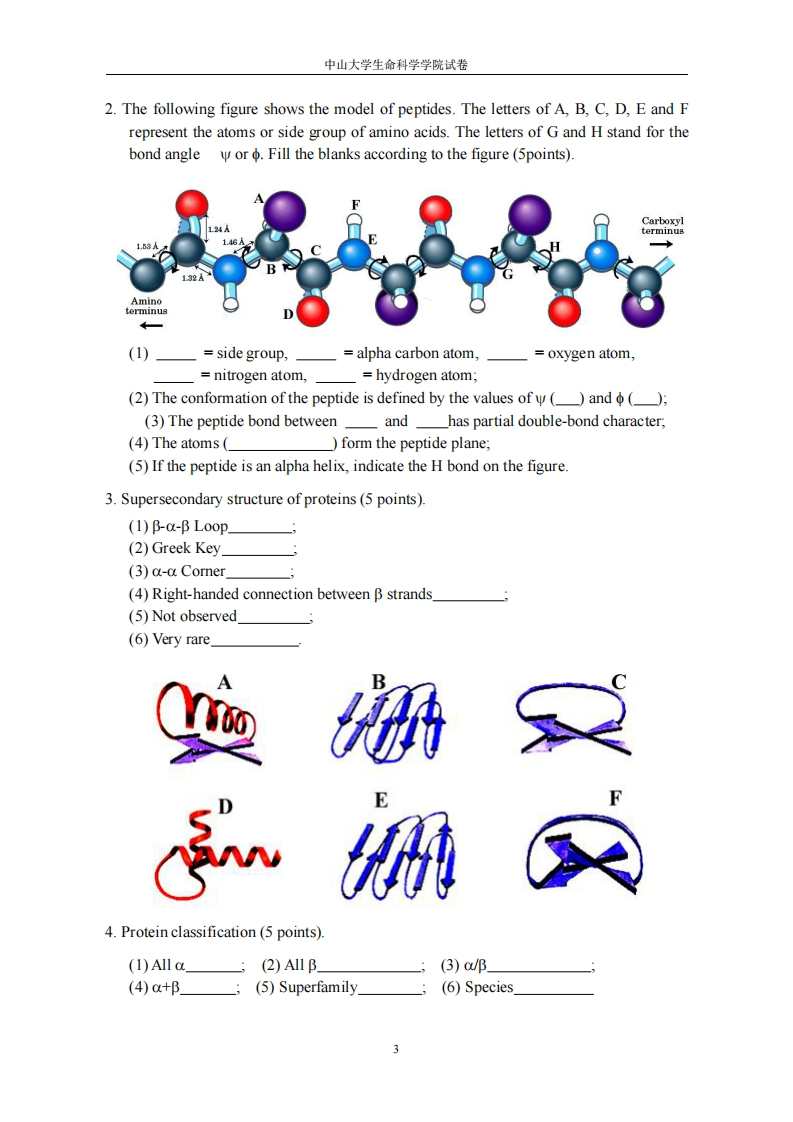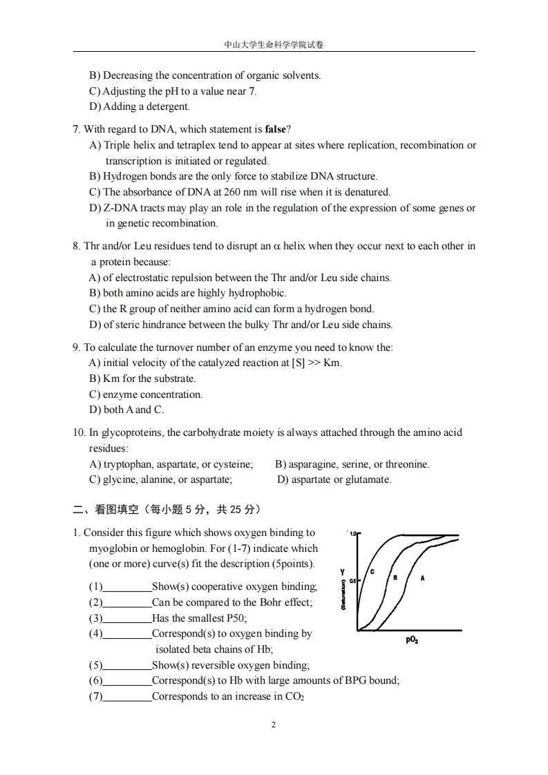 中山大学生命科学学院试卷生物化学I(2017年秋季学期,A卷)专业(班级):姓名:学号:阅卷教师:题号二三四五合计分数警示《中山大学授予学士学位工作细则》第六条:“考试作弊不授予学士学位”。一、选择唯一正确答案(每小题1.5分,共15分)1.With regard to amino acids,which statement is false?A)Amino acids can act as proton donors and acceptors.B)All amino acids discovered in organism are L enantiomers.C)An L amino acid can be Dextrorotary.D)Non-standard amino acids can be found in the hydrolysis product of a protein.2.In a highly acidic solution,pH=1.3,the dominant form of glycine is:A)NH2-CH2-COOH:B)NH3+-CH2-COOH;C)NH2-CH2-CO-;D)NH3*-CH2-COO-3.In the isoelectric form of a tetrapeptide:A)The amino and carboxyl termini are not charged.B)Two internal amino acids of the tetrapeptide cannot have ionizable R groups.C)The total net charge is zero.D)Only the amino and carboxyl termini contribute charge.4.Which would elute first from a gel-exclusion chromatographic column?A)a negatively charged protein of MW=40,000B)a positively charged protein of MW=40,000C)a protein at its isoelectric point of MW=30,000D)a polysaccharide of MW=100.0005.In an aqueous solution,protein conformation is determined by two major factors.One isthe formation of the maximum number of hydrogen bonds.The other is the:A)formation of the maximum number of hydrophilic interactions.B)maximization of ionic interactions.C)minimization of entropy by forming a water solvent shell around the protein.D)placement of all hydrophobic amino acid residues within the interior of the protein.6.You can destabilize a duplex DNA molecule in an aqueous solution byA)Decreasing the concentration of salt.