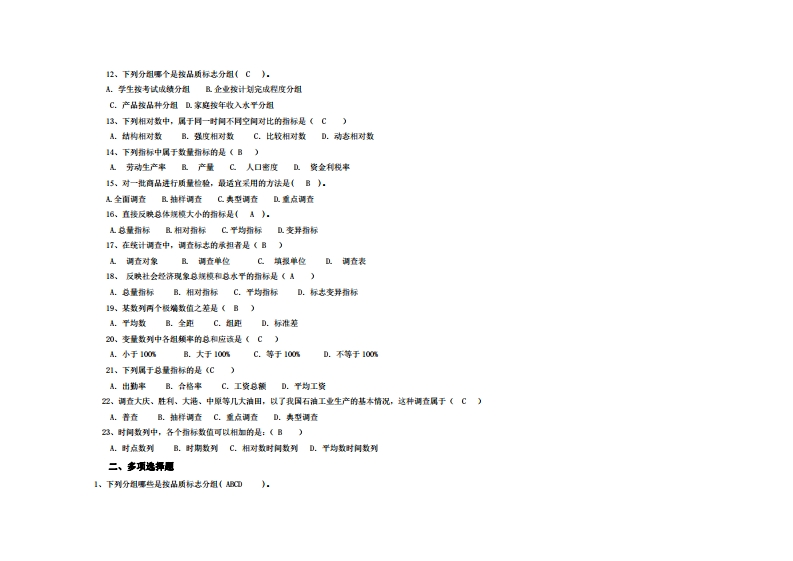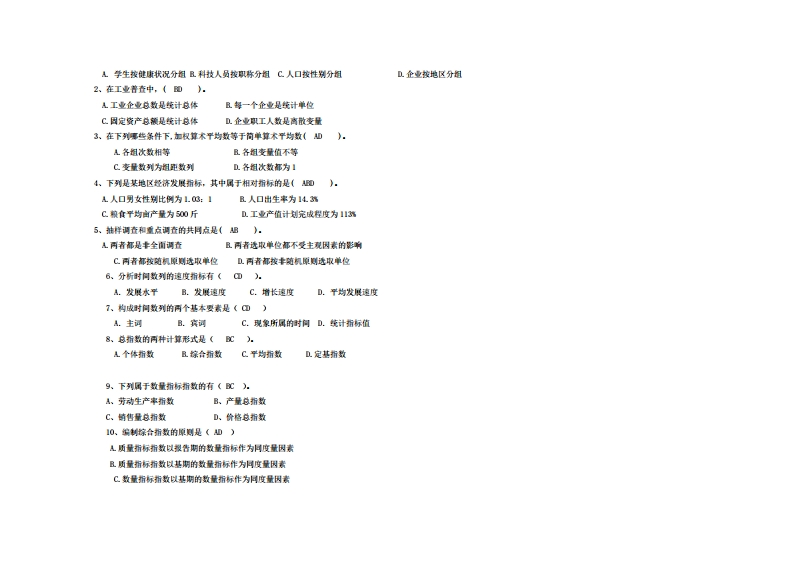 中山大学《卫生统计学】2019-2020学年第一学期期末试卷一、单项1、计算结构相对指标时,总体各部分数值与总体数值的对比求得的比重之和(C》。A小于100m且大于100mC等于100mD.小于域大于102、调查时间是折(&》:A调查货料所属的时间且进行调查的时间C调查工作的期限D调查货料保送的时间3、下列分组中事个是按型数量标志分组(&》:A企业按年生产修力分组且企业工人按性判分组C人口按民铁分图几家庭按城镇分图4、统计分组的核心月题是《A)A.透择分组标志B.确定组数C.确定分组形式D.划分各组界限5、已知5个水果商店草果的单价和时售额,要求计算5个商店草果的平均单价应采用(C)A.简单算术平均数B.如权算术平均数C.如权调和平均数D.几何平均数6、在全更一定的条件下,组更大小与组数多少是《B)。A.正比关系B.反比关系C.有时正比关系,有时反比关系D.两者无关系7、构成统计总体的个别事物称为(C》。A.调查总体且调查单位C总体单位D标志值8、由反装总体各单位数量特征的标志值汇总得出的指标是(B》。A总体单位总量且总体标志总量C相对指标D平均指标9、若把全部产品分为合格品与不合格品,所采用的标志属于《A)A.是标志B.不麦标志C.数量标志D.品质标志10、基期为前一期水平的增长量是《C)A.平均增长量B.累计增长量C.逐期增长量D.年距增长量11、某厂生产费今年比去年增长50%,产量增长251,则单位成本上升了(A)4.20mB.25%C.2%0.75%