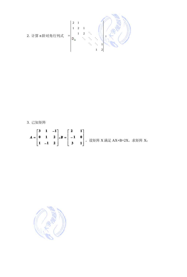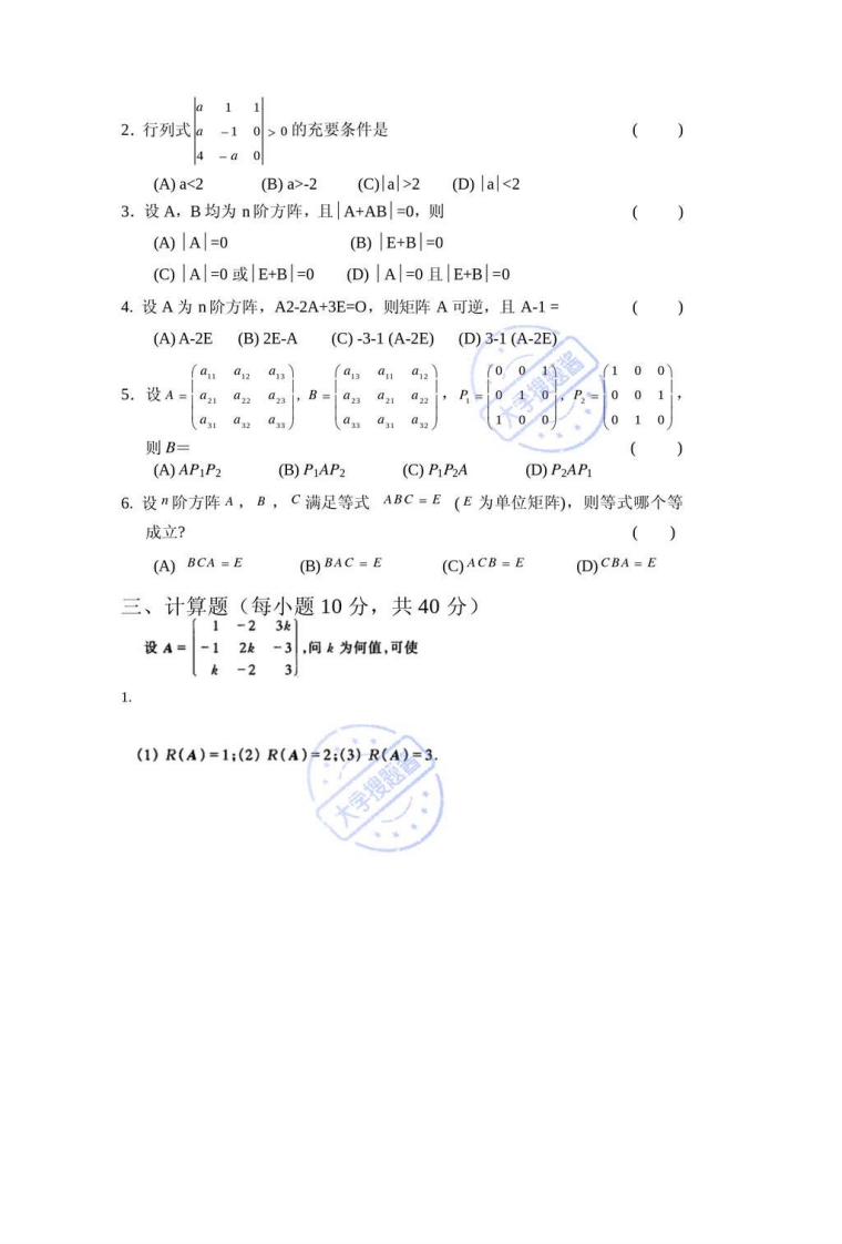 中山大学2012-2013学年第一学期《线性代数》期中试题(A卷)专业:学号:姓名:一、填空题(每小题3分,共18分):1.4阶行列式中,含有a。a的项为2.设A为n阶矩阵,且A03A0E10,其中E为n阶单位矩阵,则A+2E的逆矩阵3.计算下列行列式的值,2021h2041031002044.行列式1992003950301300600h2035.设A111,则30243571A31+A32+A03gau6.计算0aaan0000二、单项选择题(每小题3分,共18分):anap4an D an2 Da1.设D0an9则D03a14aa0aa0an3a 4a0 a(A)-3D(B)3D(C)12D(D)-12DK孕搜