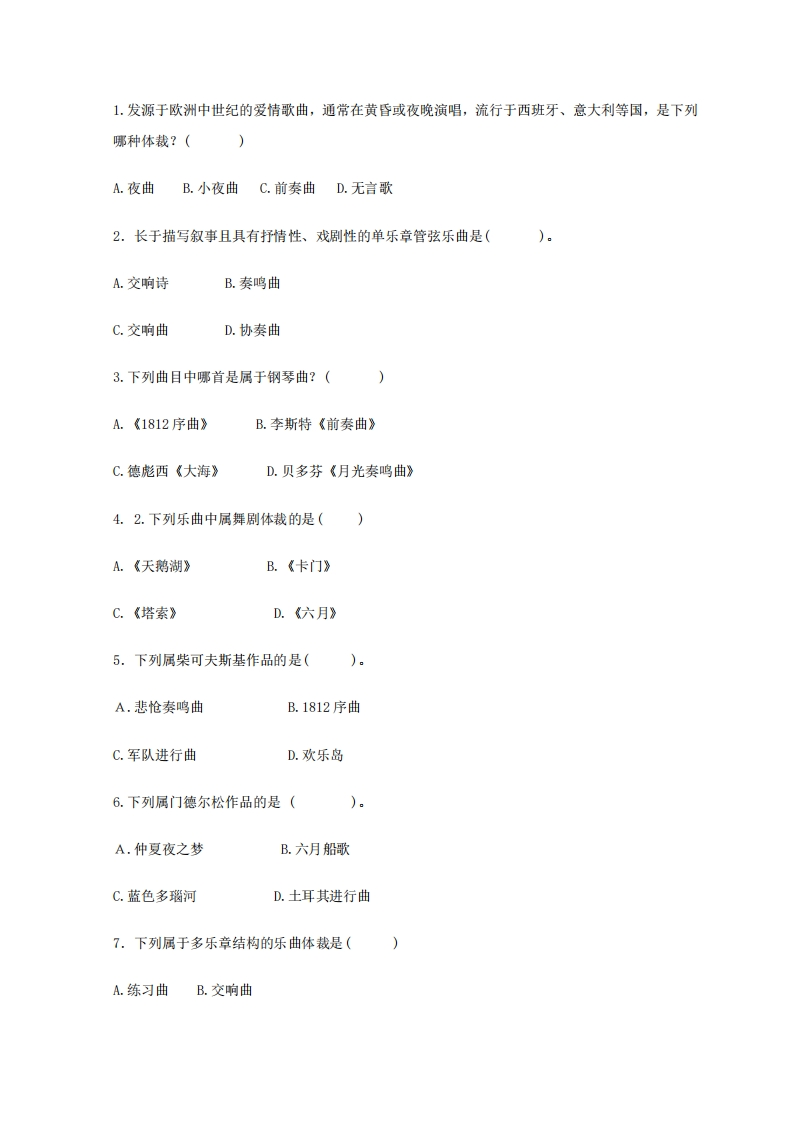 中央音乐学院2021-2022学年第一学期西方音乐史期末试题考试时间:100分钟考试形式:闭卷一、填空题(本大题共9小题,每空2分,共40分)1、希腊古典时期伟大的三位悲剧诗人是_-一和2、西方最早的复调音乐产生在世纪,被称为3、中世纪兴起的复调音乐形式主要有等。4、1597年上演了由利努契尼写剧本、佩里作曲的一,由于该作品的乐谱只留下残片,所以人们通常把1600年上演,保留完整的,由利努契尼写脚本,佩里和卡契尼作曲的视为最早的一部歌剧。5、威尼斯歌剧作曲家创作的歌剧《奥菲欧》,是自歌剧诞生后第一部真正意义的歌剧,它使歌剧艺术从此进入一个成熟的发展期。6、巴罗克时期的古组曲是由不同国家的四种不同风格的舞曲组成的,分别是」7、意大利作曲家对大协奏曲的定型起决定性的作用,确立了快、慢、快的三乐章结构,他创作了著名的大协奏曲分别题为《春》、《夏》、《秋》、《冬》,对标题音乐作出一定的贡献。8、意大利作曲家确立了那不勒斯歌剧序曲快一慢一快的三段形式,使之成为交响曲的先声。9、作曲家创作的清唱剧《弥赛亚》于1742年首演于都柏林,该剧使他蜚声世界,并成为音乐史上的经典之作:他的器乐作品《皇家烟火音乐》和是巴罗克时期的杰作,为世人传颂。二、(本题9个小题,每小题3分,共27分)