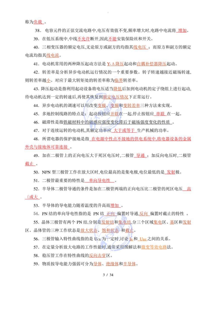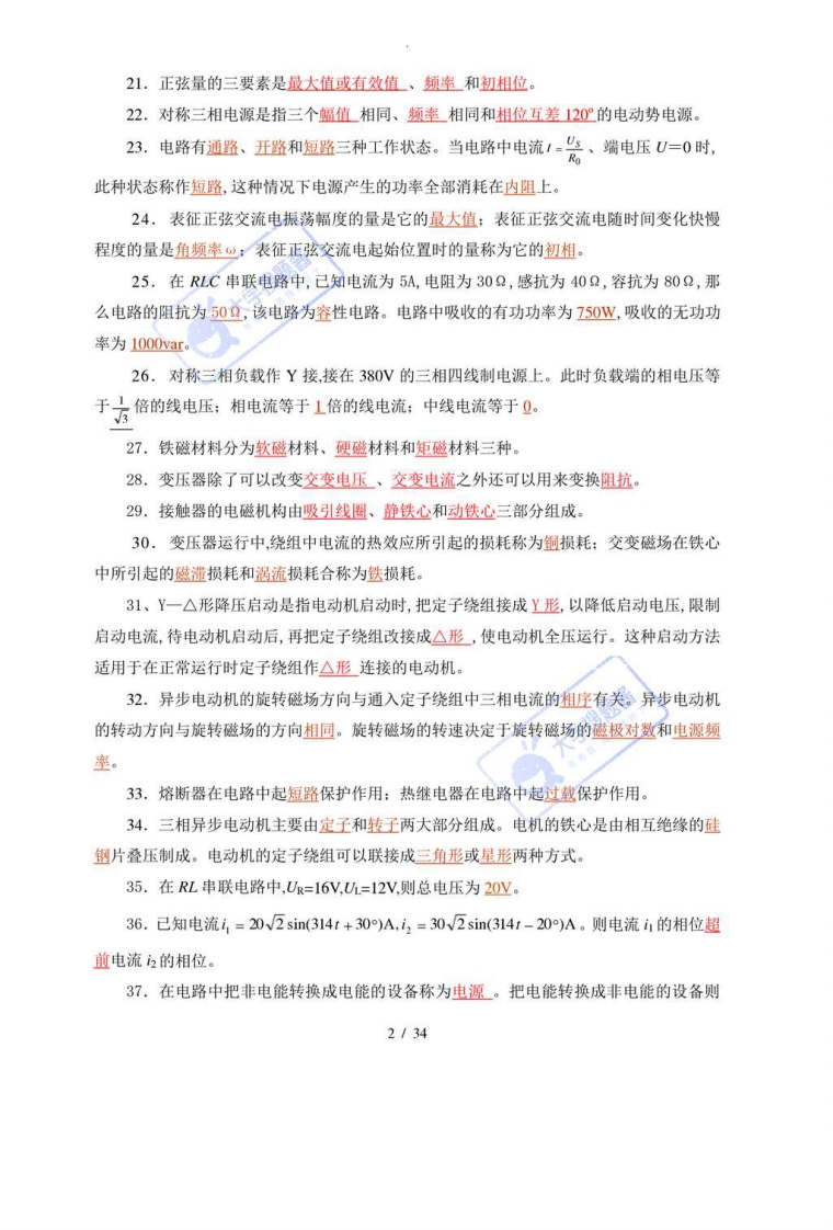 一、填空题1.已知图中U1=2V,U2=-8V,则UAB=-1Q。2.电路的三种工作状态是通路、断路、短路。3.有三个6Ω的电阻,若把它们串联,等效电阻是18?;若把它们并联,等效电阻2Ω:若两个并联后再与第三个串联,等效电阻是9Ω。4.用电流表测量电流时,应把电流表串联在被测电路中:用电压表测量电压时,应把电压表与被测电路并联一。5.电路中任意一个闭合路径称为回路:三条或三条以上支路的交点称为节点6.电路如图所示,设U=12V、I=2A、R-62,则UAB=-24V。7.直流电路如图所示R1所消耗的功率为2W,则R2的阻值应为22。8.电路中电位的参考点发生变化后,其他各点的电位均发生变化。9.在直流电路中,电感可以看作短路,电容可以看作断路。9.我国工业交流电采用的标准频率是50Hz。10.三相对称负载作三角形联接时,线电流h与相电流Ip间的关系是:I=√3h.。11.电阻元件是耗能元件,电容元件是储能元件。12.已知一正弦电压u=311si<628-60°>V则其最大值为311V,频率为100Hz,初相位为-60°。13.在纯电阻交流电路中,已知电路端电压u=311sin<314t-60°>V,电阻R=102,则电流I=22A,电压与电流的相位差中=0°,电阻消耗的功率P=4840W。14.三角形联结的三相对称负载,若线电压为380V,则相电压为380V:若相电流为10A.则线电流为17.32A。15.式Qc=Xc是表示电容元件在正弦电路中的无功功率计算公式。16.正弦交流电压的最大值Um与其有效值0之比为√217.电感元件是一种储能元件,可将输入的电能转化为磁场能量储存起来。18.若三相电动势依次达到最大值的次序为e1e2e3,则称此种相序为正序。19.在正弦交流电路中,电源的频率越高,电感元件的感抗越大。20.已知正弦交流电压的有效值为200V频率为100Hz,初相角为30°,则其瞬时值表达式u=282.8sin〔628t+30°。1/34