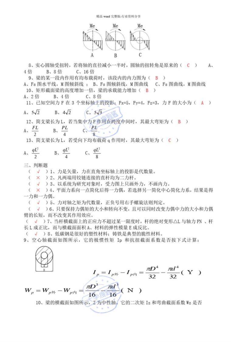 《工程力学》复习题一、填空题1、力的三要素是力的大小、方向和作用点。2、工程上常遇到只受两个力作用而平衡的构件,称为二力构件。3、力偶的三要素是力偶矩的大小、力偶的转向、力偶作用面的方位。4、平面任意力系的主矢,它的大小和方向与简化中心的位置无关:平面任意力系的主矩一般与简化中心的位置有关。5、构件抵抗破坏的能力称为强度:构件抵抗变形的能力称为刚度:构件这种保持其原有几何平衡状态的能力称为稳定性。6、载荷卸除后能消失的变形称为弹性变形:载荷卸除后不能消失的变形称为塑性变形。7、轴向拉伸或压缩时杆件的内力称为轴力:圆轴扭转时的内力偶矩称为扭矩:平面弯曲的内力为剪力和弯矩。8、归纳起来,杆件变形的基本形式有以下四种,即轴向拉伸或压缩:剪切:扭转:弯曲。9、力在空间坐标轴上的投影有两种方法,即直接投影法和二次投影法。10、低碳钢在整个拉伸过程中大致可分为4个阶段,分别为线弹性阶段,屈服阶段,强化阶段和缩颈阶段。11、工程上通常把伸长率6≥5%的材料称为塑性材料材料:把6∠5%的材料称为脆性材料材料。12、纯弯曲时,沿梁的高度一定有一层纵向纤维既不伸长又不缩短。这一纤维层称为中型层。其与横截面的交线称为中性轴。13、为便于材料力学问题的理论分析,对变形固体作了连续性假设、均匀性假设和各向同性假设。14、矩形截面梁的高度增加一倍,梁的承载能力增加4倍,宽度增加一倍,承载能力又增加2倍。二、单项选择题1、两种不同材料制成的等截面直杆,在相同的拉力作用下,则(C)。A、轴力不相同,应力相同:B、轴力相同,应力不相同:C、轴力相同,应力也相同。2、低碳钢在整个拉伸过程中大致可分为(B)A、3个阶段B、4个阶段C、5个阶段3、对于等截面杆件,利用强度条件(Omx=A≤[o])可以解决(c)强度计算问题。A、一种B、二种C、三种4、剪切的实用计算公式为x=,已知FS=12,A=300m2,,切应力(B)AA、35MPaB、40MPaC、45MPa5、传动轴的转速n=200r/min,其传动的功率P=20kw,作用于该轴的外力偶矩为(B)A、95.49N.mB、954.9N.mC、9549N.m6、应用拉压正应力公式可=的条件是(C)A大学搜题酱A应力小于弹性极限B、应力小于屈服极限C、外力的作用线与轴线重合,7、如图所示受扭圆轴横截面上的切应力分布图中,正确的结果是A)