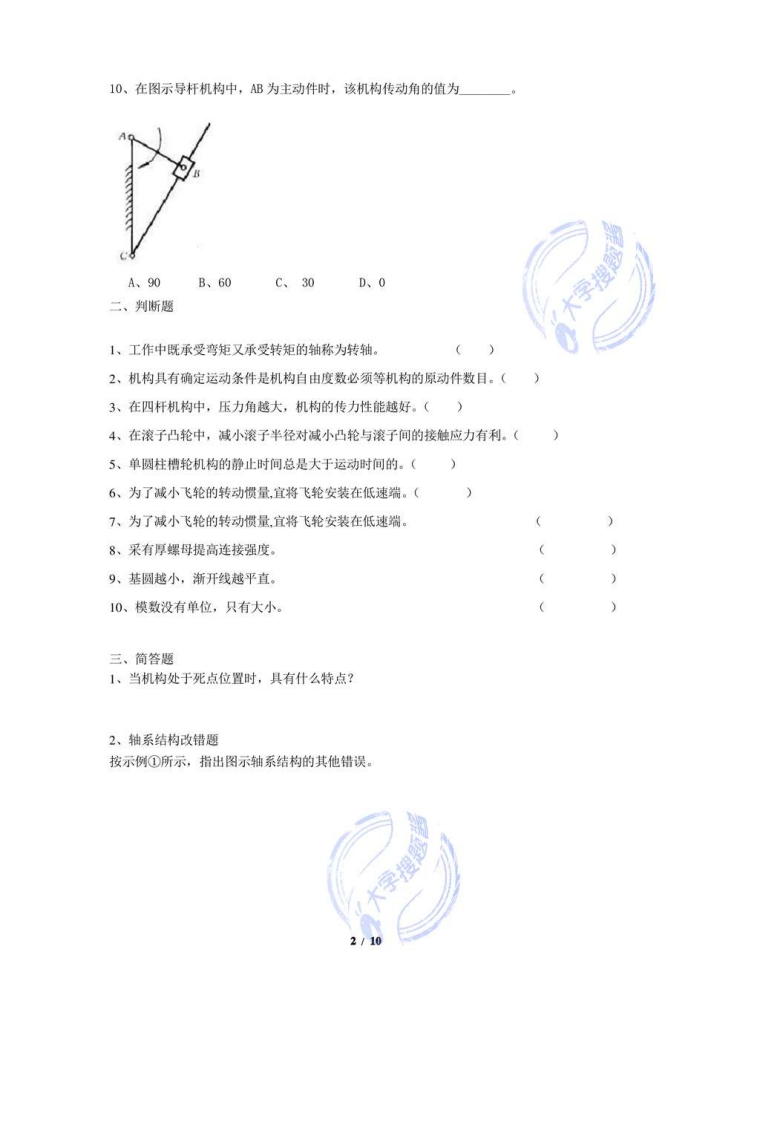 《机械设计基础》复习题一、选择题1、有两个平面机构的自由度都等于1,现用一个带有两较链的运动构件将它们串成一个平面机构,则其自由度等于A、0:B、1:C、22、连杆机构行程速比系数是指从动杆反、正行程A、瞬时速度的比值:B、最大速度的比值:C、平均速度的比值。3、设计连杆机构时,为了具有良好的传动条件,应使A、传动角大一些,压力角小一些:B、传动角和压力角都小一些:C、传动角和压力角都大一些。4、凸轮与从动件接触处的运动副属于A、高副B、转动副C、移动副5、槽轮机构中,当运动系数τ=1时,说明A、槽轮静止不动B、槽轮连续转动C、静止时间大于运动时间D、运动时间大于静止时间6用来固定零件之间的相对位置的。A、定位销B、连接销C、安全销7、带张紧的目的是A、减轻带的弹性滑动B、提高带的寿命C、改变带的运动方向大字搜题酱D、使带具有一定的初拉力8、一对渐开线齿轮连续传动的条件为A、e≥1B、e≥2C、e≤1D、e≥1.39、当采用轴肩做轴向定位时,为了使轴上零件能靠紧定位面,轴肩根部的圆角半径应零件的倒角。A、大于B、小于C、等于1/10