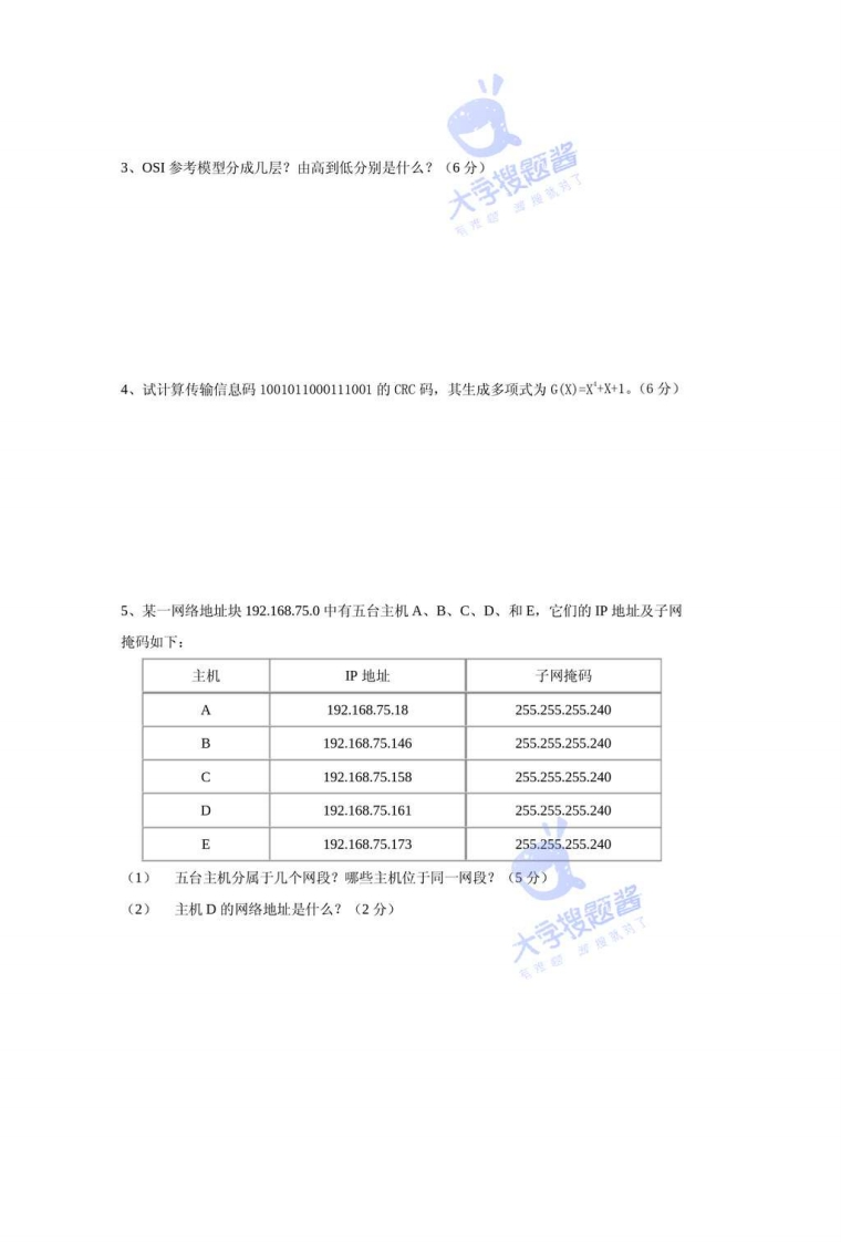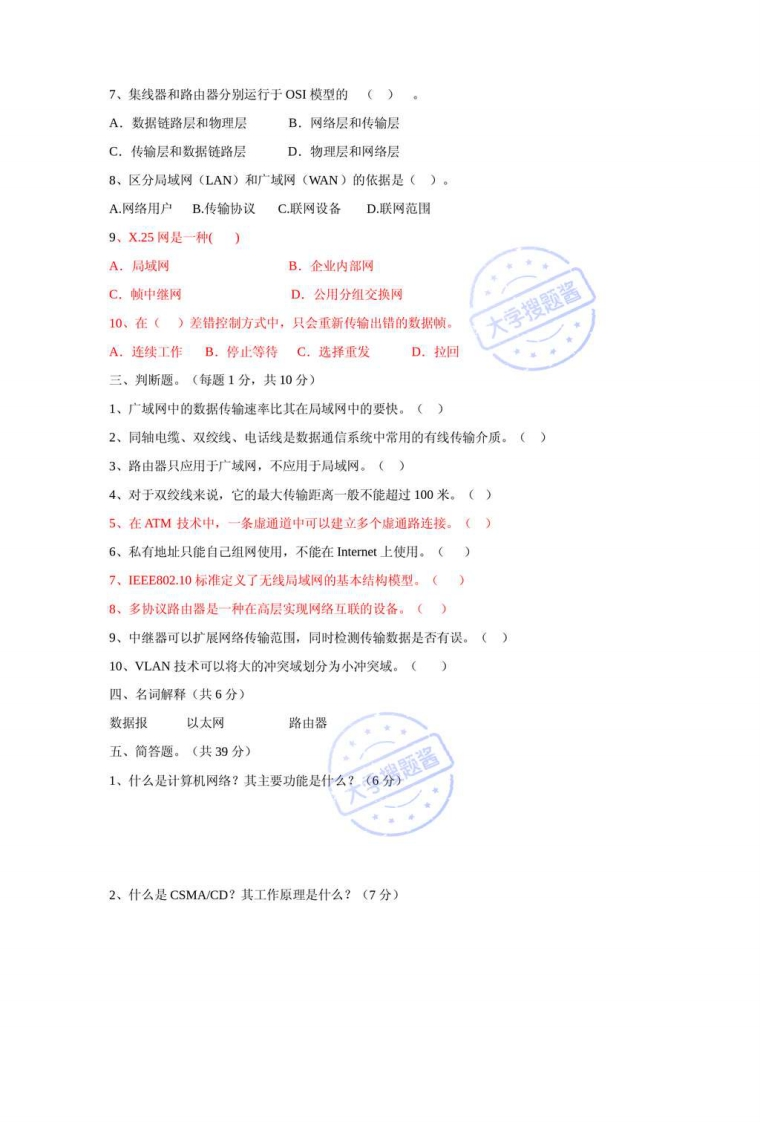 《计算机网络》试卷一、填空题。(每题2分,共20分)1、在各类地址中,B类地址的默认子网掩码为】2、ADSL的中文意思是3、按照网络的拓扑结构,可将网络主要分为星形网络、、网状形五大类。4、用电路交换技术完成数据传输要经历一三个过程。5、P地址长度在Pv4中为位,而在IPv6中则为位。6、P地址的主机部分如果全为1,则表示地址,P地址的主机部分若全为0,则表示地址,127.0.0.1被称做地址。7、防火墙的主要类型有和8、在TCPP模型中,能提供端到端通信的是层9、ATM的信元具有固定的长度,即字节,其中5个字节是信头。10、奈奎斯特准则与香农定律描述了与的关系。二、单项选择题。(每题1分,共10分)1、下列传输介质中,哪种传输介质的抗干扰性最好?()A、光缆B、双绞线C、同轴电缆D、无线介质2、网址“www.pku.edu.cn"中的"cn"表示A.英国B.美国C.日本D.中国3、192.168.1.1代表的是()地址。A、A类地址B、B类地址C、C类地址D、D类地址4、下列四项中表示域名的是A.www.cctv.com B.hk@zi.school.comC.ziwww@china.com D.202.96.68.12345、一个B类地址段可以容纳()台主机。A、254B、1024C、65534D、20486、双纹线的距离一般不超过()米。A、50B、100C、200D、500