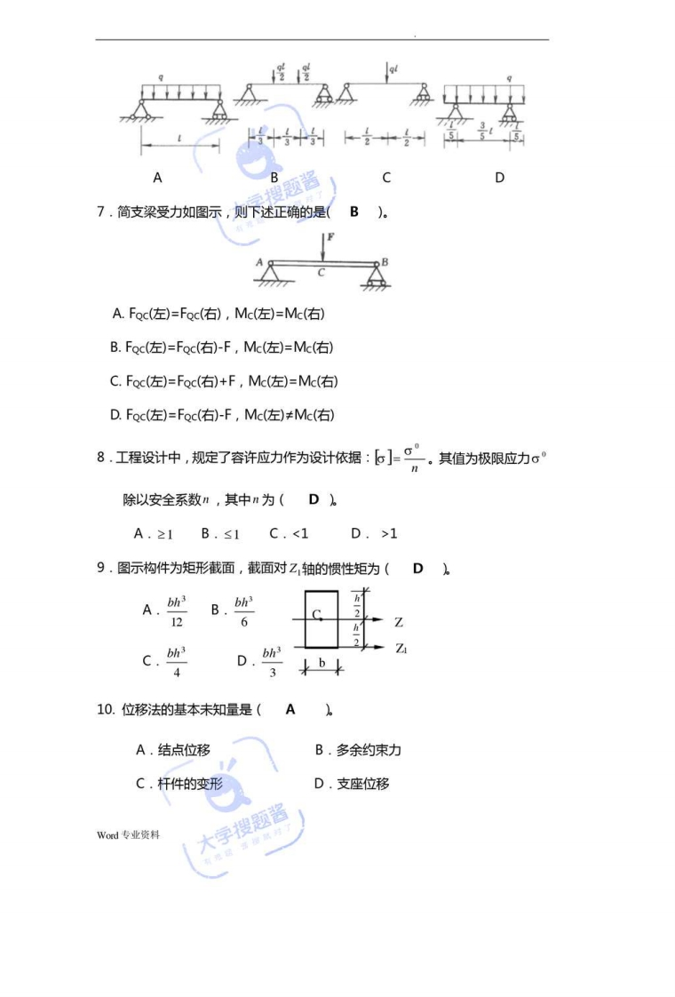 《建筑力学》复习题及参考答案一、单项选择题1,固定端约束通常有(C)个约束反力。(A)-(B)二(C)三(D)四2.如右图所示结构为(AA.几何瞬变体系B.几何可变体系C.几何不变体系,无多余约束D.几何不变体系,有一个多余约束3.若刚体在二个力作用下处于平衡,则此二个力必(A。A.大小相等,方向相反,作用在同一直线。B.大小相等,作用在同一直线。C.方向相反,作用在同一直线。D.大小相等4.一个点和一个刚片用(C)的链杆相连,组成几何不变体系。A.两根共线的链杆B.两根不共线的链杆C,三根不共线的链杆D.三根共线的链杆5.静定结构的几何组成特征是(D)A.体系几何可变B.体系几何瞬变C.体系几何不变D.体系几何不变且无多余约束6.图示各梁中|M|max为最小者是图(D大学搜题酱Word专业资料
