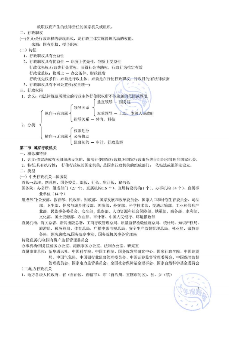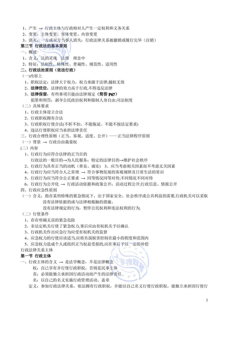 《行政法与行政诉讼法学》复习概要行政法基本原理第一节行政法的概述实质行政国家行政一带国微公共行政形式行政一、行政非国家行政企事业单位、社会团体私行政(一)公共行政与私行政区别1、性质不同→公:代表国家职能活动,公共性质:私:团体自身利益2、目的不同→公:公共秩序:私:个别、局部利益3、手段不同+公:享有特权行政=公共行政=行政机关行使行政权(二)行政权1、概念:执行法律、管理国家事务的权力(1)行政权与政权法权政权→统治权→主权国家→国家权力司法权行政权(2)行政权与权力、权利(3)行政权与行政职权(4)行政权与公民权利一→公民权利是行政权的前提和基础:行政权是公民权利保障2、行政权的双重作用:保障行政机关的有效执法:侵犯公民权二、行政法(一)概念是一个独立部门,因调整行政主体行使行政职权而产生的特定关系的法律规范的总称。(二)调整的法律关系1、组织行政关系2、管理行政关系3、监督行政关系→行政诉讼、复议4、救济行政关系(三)行政法的特征内涵丰富、范围广、技术性强1、在内容上的特点具有很强的命令性、服从性(不平等)行政法律规范内容易于变动。2、在形式上的特点:数量多,没有统一法典:实体法规和程序法规交织在一起。三、行政法的渊源:宪法,法律,行政法规,行政规章,地方性法规和自治条例、单行条例,法律解释国际条约。第二节行政法律关系一、概述1、含义:调整行政关系的法律规范2、特征:必有一方是行政主体:具有不对等性:内容法定性:权利义务的复合性二、行政法律关系的要素1、主体行政法律关系≠行政主体物一物质、货币2、客体智力成果一专利权、发明、著作权行为一作为、不作为3、内容:行政主体的权利和义务:行政相对人的权利和义务三、行政法律关系的变动一产生、变更、消灭