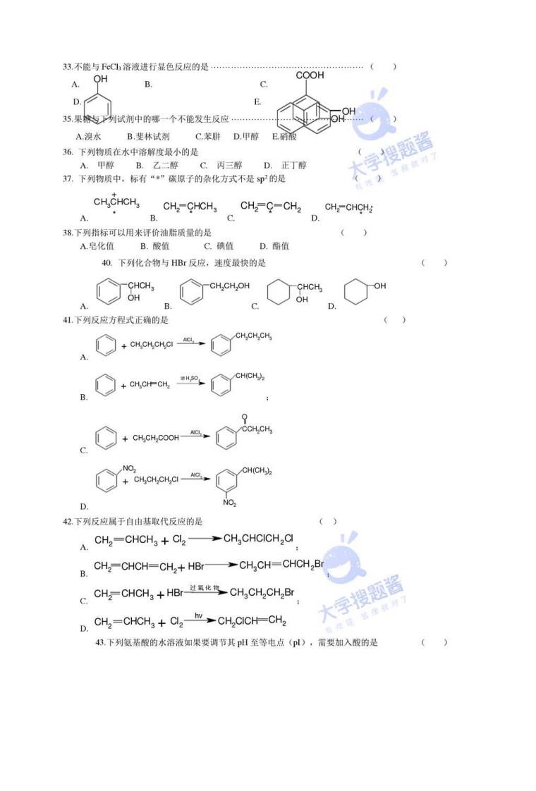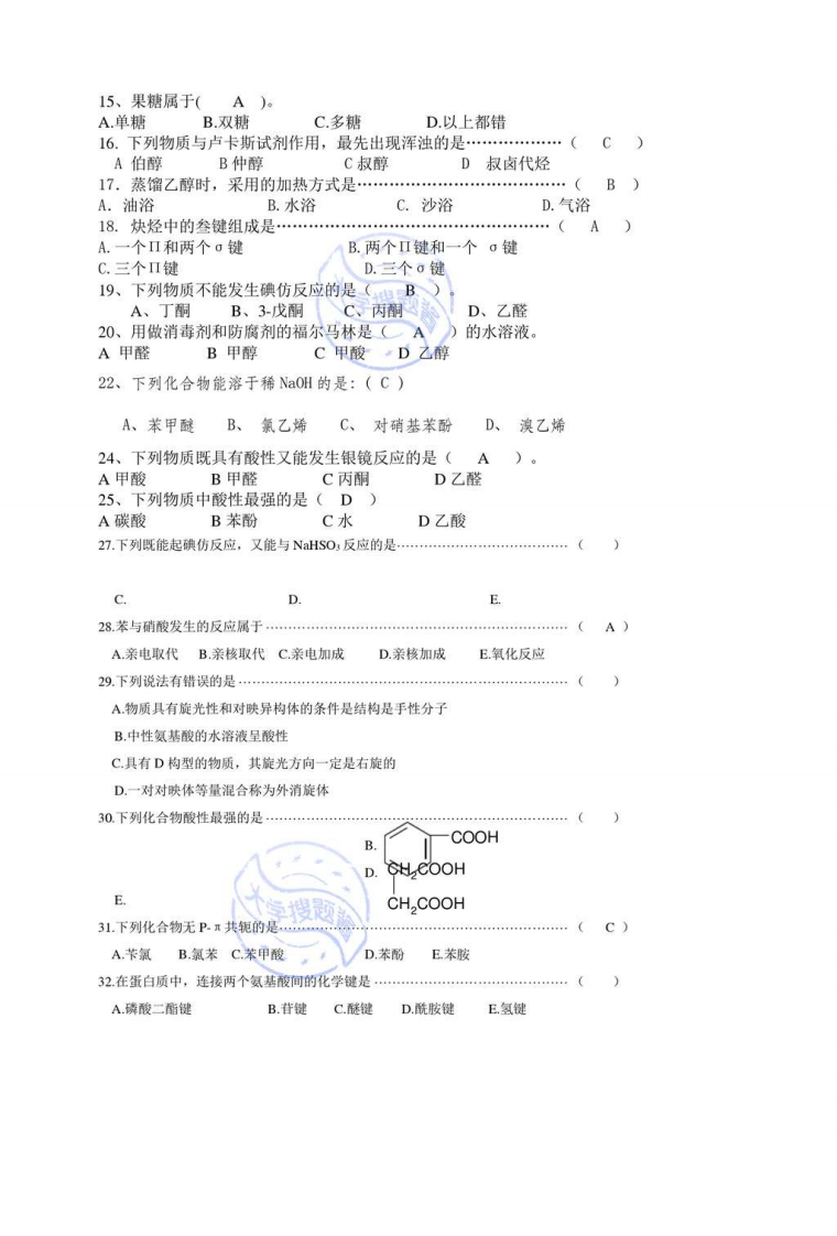 《有机化学》试题库(2016)一、选择题(一)单选题1、不对称烯烃与卤化氢等极性试剂进行加成反应时,加成反应的产物应遵守(A)。A马氏规则B定位规则C反马氏规则D扎衣采夫规则2、(CH3)CHCH2C1与(CH)3CC1之间是什么异构体:(A)A.碳链异构B.位置异构C.官能团异构_D.互变异构3、下列各组化合物中有顺反异构体的是:(C)4、下列哪种类型的化合物可用卢卡斯试剂鉴别(B)A、卤代烃B、伯、仲、叔醇C、醛酮=D、烯烃5、下列化合物中溶解性最大的是(B)。A CHCHCH-OHB CH OH CH-CH OH)C CH:CH2CHD CH;OCH-CH。¥6、下列化合物中,能发生银镜反应的是(DA甲酸B乙酸C乙酸甲酯D丙酮7、在食品及药品工业中,常采用(D)作防腐剂A碳酸氢钠B乙酸钠C亚硝酸钠D苯甲酸钠8、下列四种化合物按碱性强弱排列正确的是(B)。A.①>②>③>④B.④>③>②>①C.②>①>③>④D.②<①<③<④9、蛋白质是(C)物质。A酸性B碱性C两性D中性CH3CH,CH十OH10、下列与日等同的分子是(A)CH3HOHHHOCH2CH3 CH,CH2OH HCHs-HOAHBCH3 C CH2CHsDCH2CH311、烷烃的同系物通式符合(A)。A.Cn H2n+2B.CnH2n12、单烯烃与单环烷烃的通式(A)。A相同B.不同C.差2个HD,以上都错14、下列化合物中酸性最弱的是(A)大学题A、CH3COOHB、FCH2COOHC、BrCH2COOHD、CICHCOOH