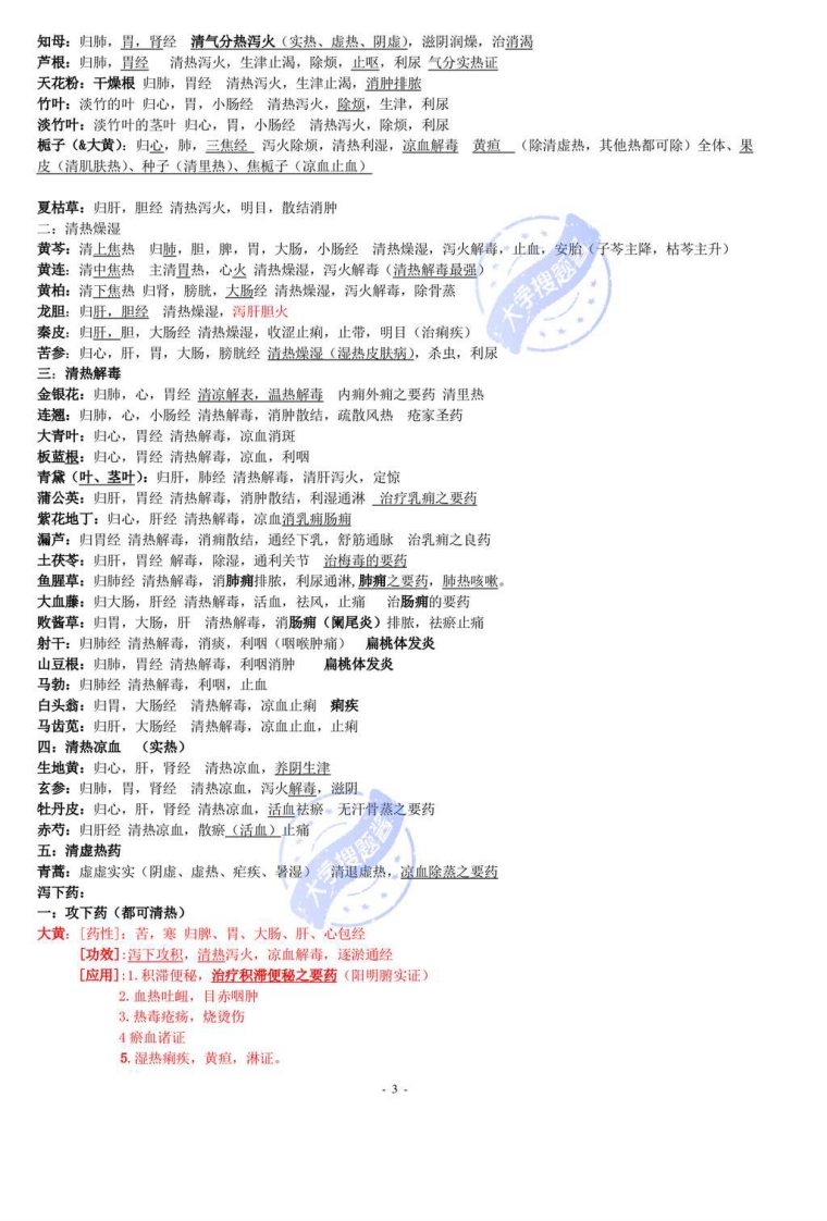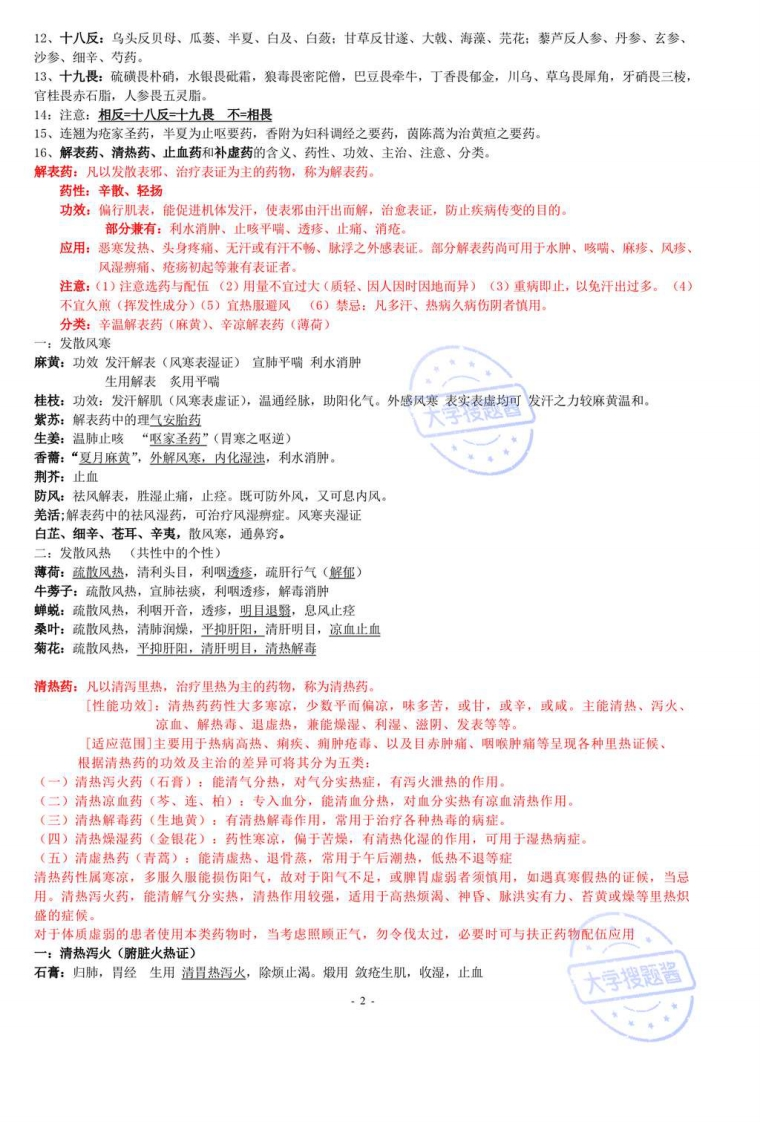 《中药学》资料整理中药:就是指在中医理论指导下,用于预防、治疗、诊断疾病并具有康复与保健作用的物质。包括:植物药、动物药、矿物药、化学生物制剂。1、《神农本草经》全书载药365种,分为上、中、下三品。《神农本草经》序论中简要咳备地论述了中药的五个基本理论:如四气五味、有毒无毒(三点药性理论)、配伍法度、辨证用药原则、服药方法。四大经典之一。2、《本草经集注》:“以朱书神农,墨书别录”,载药730种,首创按药物自然属性分类的方法,该书还首创“诸病通用药”。一一南北朝·陶弘景3、《新修本草》,收药844种,图文并茂。是由国家组织修订和推行的,因此也是世界上公开颁布的最早成药药典。一一唐4、宋代本草学的代表作当推唐慎微的《经史证类备急本草》,简称证类本草。一一方药兼收,图文并重。5、《本草纲目》,该书共52卷,载药1892种,收集外来药物,分类“从贱至贵”。6、《本草纲目拾遗》为清代赵学敏所著,全书共十卷,载药921中,在《本草纲目》之外新增药物716种,出色完成我国本草学第六次大总结。7、道地药材:是指历史悠久,产地适宜,品种优良,产量宏丰,炮制考究,疗效突出,带有地域特点的药材。如甘肃当归,宁夏枸杞,青海大黄,内蒙黄芪,东北细辛、人参、五味子,山西党参,河南地黄,牛膝、山药、菊花,云南三七、茯苓,四川黄连、川芎、贝母、乌头,山东阿胶,浙江贝母,江苏薄荷,广东陈皮、砂四大蕲药:蕲蛇、蕲龟、蕲艾、蕲竹。四大南药:槟榔、益智、砂仁、巴戟四大怀药:地黄、牛膝、山药、菊花浙八味:白术、白芍、白菊花、郁金、贝母、玄参、延胡索、麦冬。8、炮制,古时又称“炮炙”、“修事”、“修治”,是指药物在应用前或制成各种剂型前,根据医疗、调制、制剂的需要,而进行必要的加工处理过程,是我国的一项传统制药技术。目的:1.纯净药材,保证质量,分拣药物,区分等级2切制饮片,便于调剂制剂3干燥药材,利于贮藏4矫味,矫臭,便于服用5降低毒副作用,保证安全用药6增强药物功能,提高临床疗效7改变药物性能,扩大应用范围8引药入经,便于定向用药9、四气的概念:寒热温凉四种不同的药性,又称四性。寒凉药清热泻火,凉血解毒,滋阴除蒸,泄热通便,清热利尿,清化热痰,清心开窍,凉肝息风温热药:温里散寒,暖肝散结,补火助阳,温阳利水,温经通络,引火归原,回阳救逆10、五味:是指药物有酸、苦、甘、辛、成五种不同的味道,此外还具有淡味和涩味。辛:具有发散、行气行血的作用。甘:具有补益、和中、调和药性和缓急止痛的作用。酸:收敛、固涩。苦:清泻火热,泄降气逆、通泄大便、燥湿、坚阴。成:泻下通便、软坚散结淡:渗湿利水涩:收敛,固脱。11、七情:有选择的讲两种以上的药物合在一起应用,叫做配伍,将各种药物的配伍关系归纳为单行、相须、相使、相畏、相杀、相恶、相反此七情。单行:就是单用一味药来治疗某种病情单一的疾病,也指各自发挥药效,相互不影响临床效应的两味药的配伍关系。相须:就是两种功效类似的药物配合应用,可以增强原有药物的功效。相使:就是以一种药物为主,另一种药物为辅,两药合用,辅药可以提高主药的功效。相畏:就是一种药物的毒副作用可能被另一种药物所抑制。如,半夏畏生姜。相杀:就是一种药物能够消除另一种药物的毒副作用。如,生姜杀半夏。相恶:就是一种药物能破坏另一种药物的功效。相反:就是两种药物同用能产生剧烈的毒副作用。