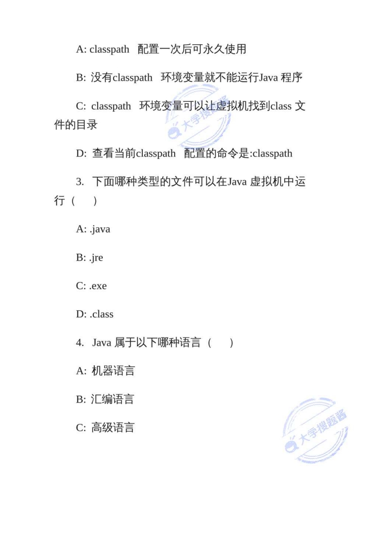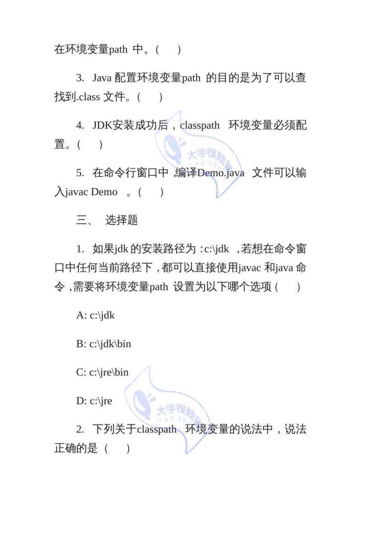 第1章Java开发入门习题填空题1.将.java源文件编译为.class文件的是【命令。2.在Eclipse窗口中选择菜单【】→New一Java Project创建Java项目。3.在安装JDK的过程中,有三个功能模块可供选择,它们分别是【】,【】和【】。4.将Hello.java文件编译为class文件,需要键入】命令。5.JRE是Java程序的【】。二、判断题1.Eclipse只是一个框架和一组服务,所有功能都是将插件组件加入到Eclipse框架中来实现的。()2.JDK安装成功后,需要将bin目录的路径配置