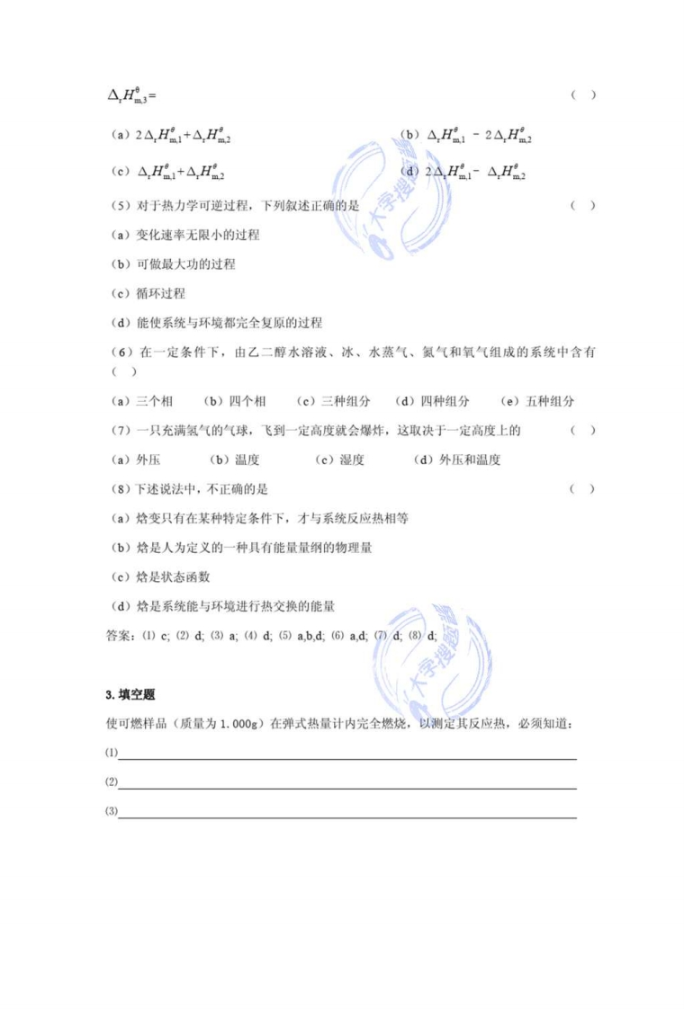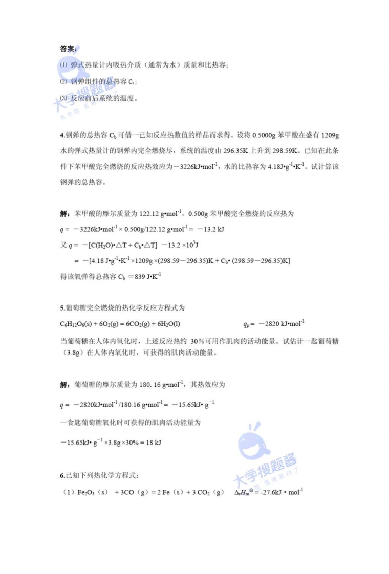 第一章热化学与能源习题解答1.是非题(对的在括号内填“+”号,错的填“-”号)(1)已知下列过程的热化学方程式为:F。(1)=F。(g):△,Hm°=30.1kJmo,则此温度时蒸发1mo1,会放出热30.1kJ。()(2)在定温定压条件下,下列两个生成液态水的化学反应方程式所表达的反应放出的热量是一相同的值。()H(g)+O(g)→HO0)2H(g+0(g)→2H200)(3)功和热是在系统和环境之间的两种能量传递方式,在系统内部不讨论功和热。()(4)反应△H的就是反应的热效应。()答案:(1)-:(2)-;(3)+:(4)-。2.选择题(将所有正确答案的标号填入括号内)(1)在下列反应中,进行1mol反应时放出热量最大的是()(a)CH)+20z(g)=C02(g)+2H0(g)(b)CH(g)+202(g)=C02(g)+2HO(g(c)CH(g)+202(g)=C02(g)+2HO0)(d)CH(g)+:(g)=co (g)+2H()(2)通常,反应热的精确的实验数据是通过测定反应或过程的哪个物理量而获得的。()(a)△H(b)p△V(c)9p(d)qv(3)下列对于功和热的描述中,正确的是()(a)都是途径函数,无确定的变化途径就无确定的数值(b)都是途径函数,对应于某一状态有一确定的值(c)都是状态函数,变化量与途径无关(d)都是状态函数,始终态确定,其值也确定(4)在温度T的标准状态下,若己知反应A→2B的标准摩尔反应焓△,H1,与反应2A→C的标准摩尔反应格△,H,则反应C→4B的标准摩尔反应格△,H的关系为