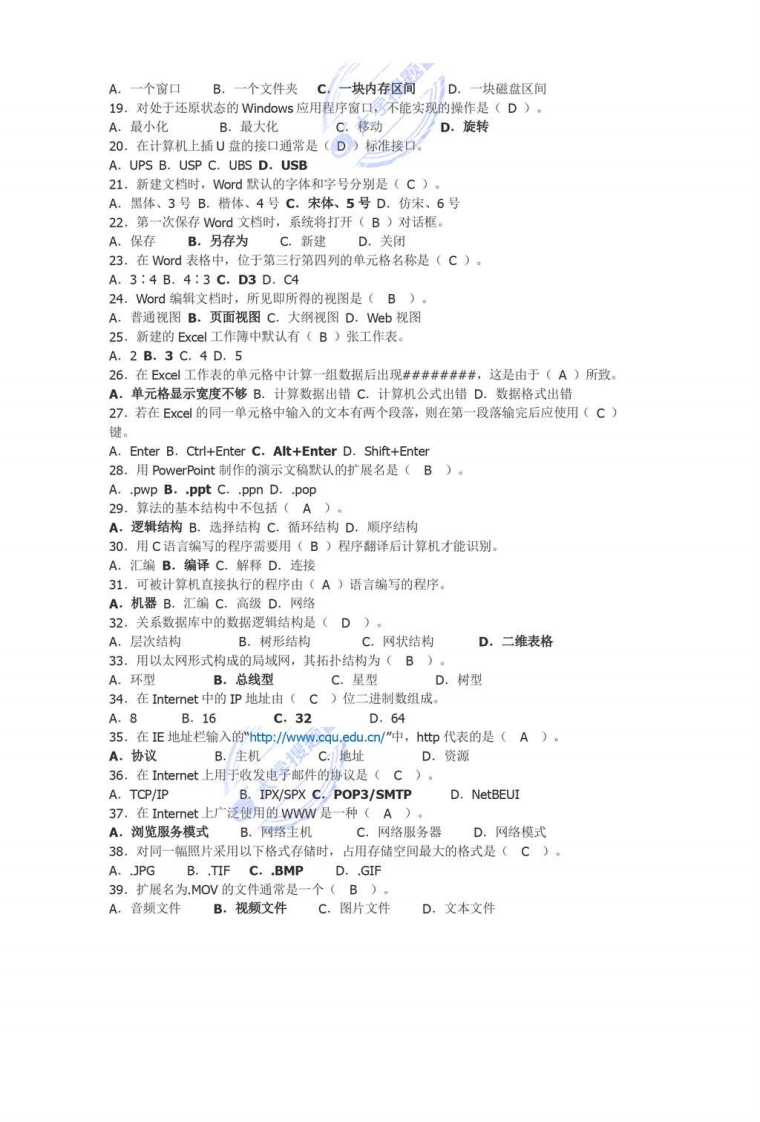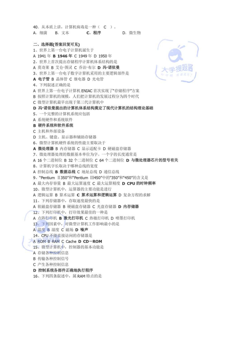 大学计算机基础试题题库及答案一、单选题练习1.完整的计算机系统由(C)组成。A。运算器、控制器、存储器、输入设备和输出设备B.主机和外部设备C.硬件系统和软件系统D.主机箱、显示器、键盘、鼠标、打印机2.以下软件中,(D)不是操作系统软件。A.Windows xp B.unix C.linux D.microsoft office3.用一个字节最多能编出(D)不同的码。A.8个B.16个C.128个D.256个4.任何程序都必须加载到(C)中才能被CPU执行。A.磁盘B.硬盘C.内存D.外存5.下列设备中,属于输出设备的是(A)。A.显示器B.键盘C.鼠标D.手字板6.计算机信息计量单位中的K代表(B)。A.102B.210C.103D.287.RAM代表的是(C)。大学搜题酱A.只读存储器B.高速缓存器C.随机存储器D.软盘存储器8.组成计算机的CPU的两大部件是(A)。A.运算器和控制器B.控制器和寄存器C.运算器和内存D.控制器和内存9.在描述信息传输中bps表示的是(D)。A.每秒传输的字节数B.每秒传输的指令数C.每秒传输的字数D.每秒传输的位数10.微型计算机的内存容量主要指(A)的容量。A.RAM B.ROM C.CMOS D.Cache11.十进制数27对应的二进制数为D)A.1011B.1100C.10111D.1101112.Windows的目录结构采用的是(A)。A.树形结构B.线形结构C.层次结构D.网状结构13.将回收站中的文件还原时,被还原的文件将回到(D)。A.桌面上B.“我的文档中C.内存中D.被副除的位置14.在Windows的窗口菜单中,若某命令项后面有向右的黑三角,则表示该命令项(A)。A.有下级子菜单B.单击鼠标可直接执行C.双击鼠标可直接执行D.右击鼠标可直接执行15.计算机的三类总线中,不包括(C)。A.控制总线B.地址总线C.传输总线D.数据总线16.操作系统按其功能关系分为系统层、管理层和(D)三个层次。A.数据层B.逻辑层C,用户层D.应用层17.汉字的拼音输入码属于汉字的(A)。A.外码B.内码C.ASCII码D.标准码18.Windows的剪贴板是用于临时存放信息的(C)。大学搜题酱