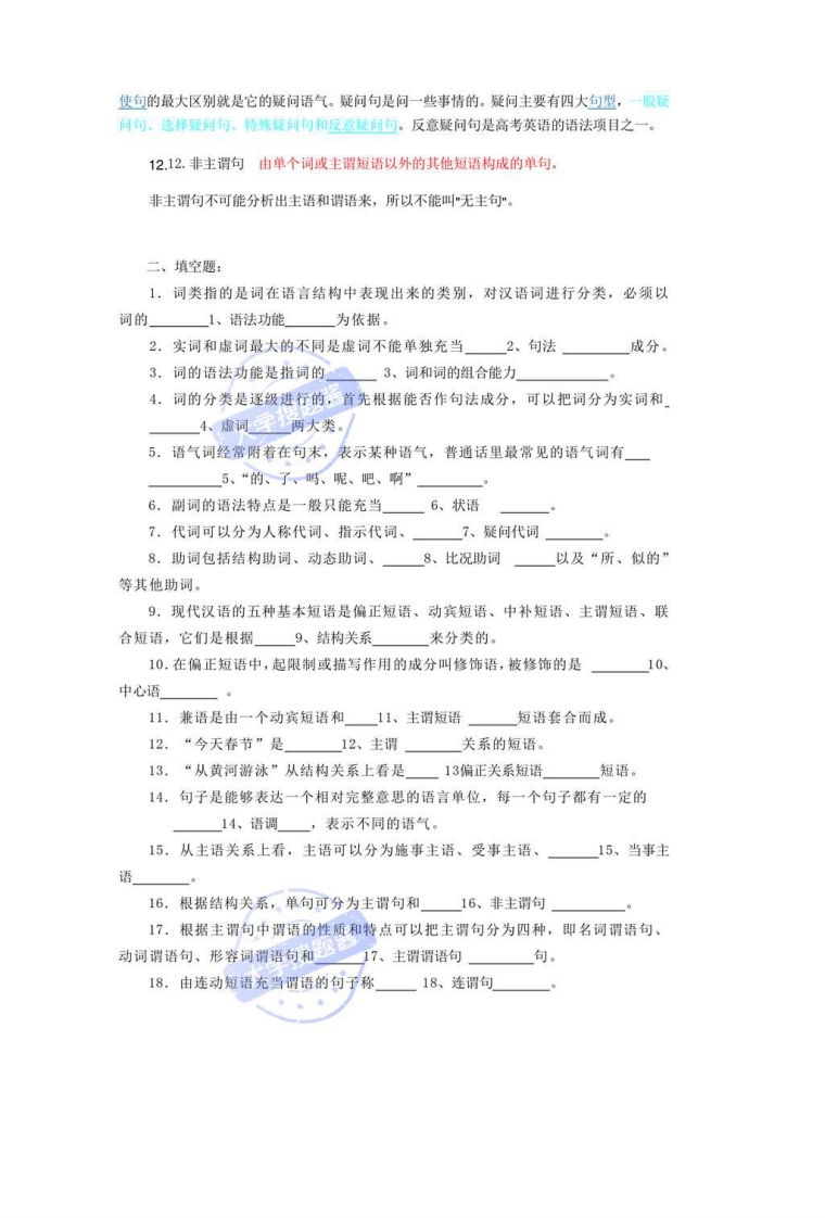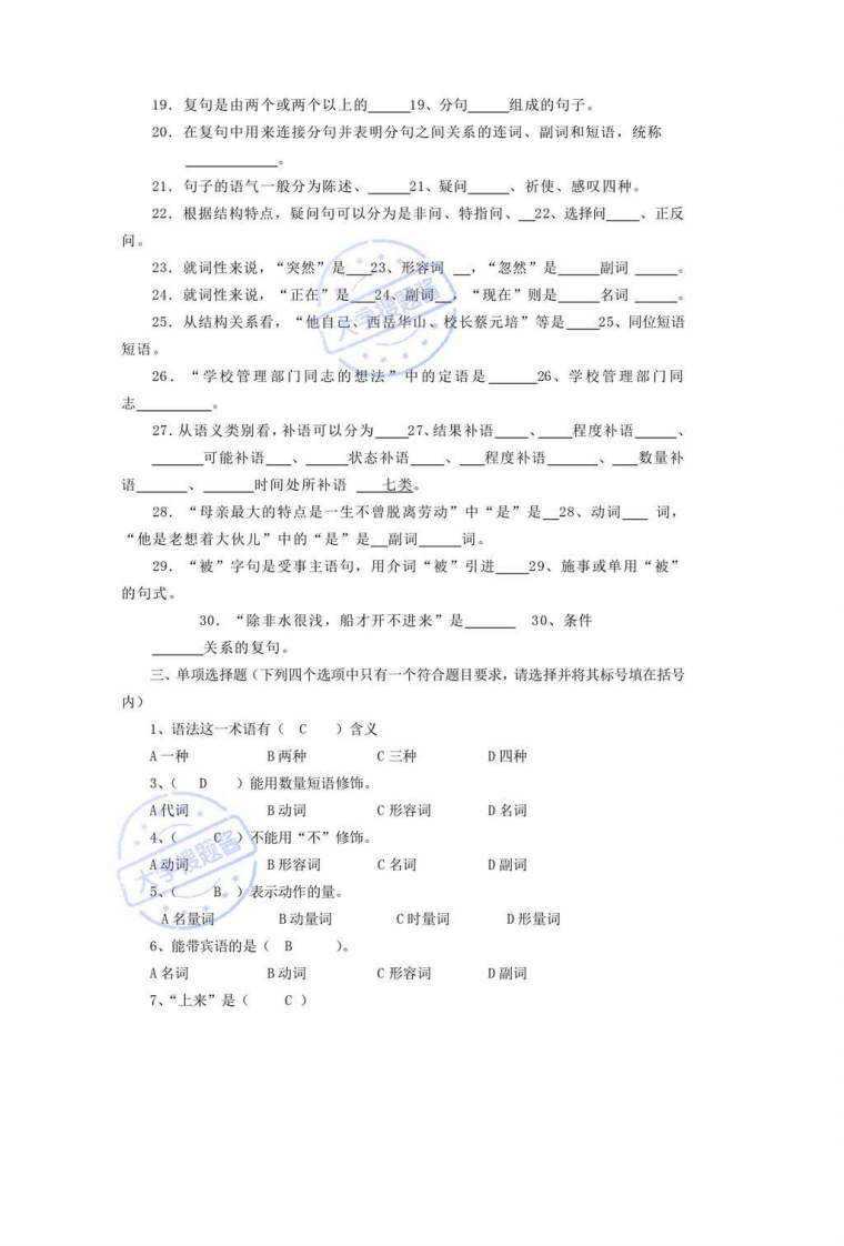 现代汉语下册(语法)考试题一、名词解释1,语法语法是语言学的一个分支,研究按确定用法来运用的词类、词的屈折变化或表示相互关系的其他手段以及词在句中的功能和关系。包含词的构词、构形的规则和组词成句的规则。语法有两个含义,一指语法结构规律本身,即语法事实。一指语法学,是探索并描写语法结构的科学,是语法学者对客观存在的语法体系的认识和说明2.实词实词是有实在意义的词,可以独立充当句子成分,一般可以单独回答问题。每一个实词都可以详细解说其词义。现代汉语实词一般名词、动词、形容词、数词、量词、代词六类。也有人认为代词属于虚词,但多数学者认可代词为实词,因为代词虽然很难解释独立语义,但毕竞其指代内容是明确的。无论在现代汉语中还是在文言文中,实词都占有绝对多的数量,因为语言的基本作用是表意,离开有实际意义的实词,这一作用将很难达到3.双宾句双宾语就是述语后面连用了两个宾语。能问两问:谁什么?给谁什么?告诉谁什么?间谁什么?例如:他给我一支笔。能带双宾的动词一般有给,告诉,教,问,通知,骂,叫”4.虚词虚词是没有实在意义的词,一般不能单独充当句子成分(副词例外),不能单独回答问题(少数副词除外)。其存在的价值在于帮助构成句子的语法结构,表示某种语法关系。汉语的虚词主要有六种:刷词、助词、连词、介词、叹词、拟声词。无论在现代汉语中,还是在文言文中,虚词的数量都相对较少,但作用却很大。5.兼语短语由前一个动词兼做后一个动词或形容词的主语,即动宾短语的宾语和主谓短语的主语套叠,形成一个宾语兼主语的兼语。有兼语的短语叫兼语短语请他进来(他:前一动词请”的宾语兼做“进来”的主语6.句子句子是语言运用的基本单位,它由词、词组(短语)构成,能表达一个完整的意思,如告诉别人一件事,提出一个问题,表示要求或者制止,表示某种感概,表示对一段话的延续或省略。句子和句子中间有较大停顿。它的结尾应该用上句号、问号、省略号、或感叹号。7.语素语素:是最小的、有意义的语言单位。8.短语短语是由句法、语义和语用三个层面上能够搭配组合起来的没有句调的语言单位,又叫词组。它是大于词而又不成句的语法单位。简单的短语可以充当复杂短语的句法成分,短语加上句遇可以成为句子。9.祈使句1.表祈使语气用来要求别人做什么或不做什么的句子。10.方位短语指方位名词附着在别的词或短语的后面所构成的短语。方位短语是名词性短语。方位短语主要表示时间、处所、范围等。如表示时间的:“会议中”、“参加工作之前”:表示处所的:“池塘边”,“黄河以北”:表示范围的:“你我之间”,“五十左右”11.11.疑问句疑问句是按照句子的语气分出来的一个类,它与陈述句、感叹句、近