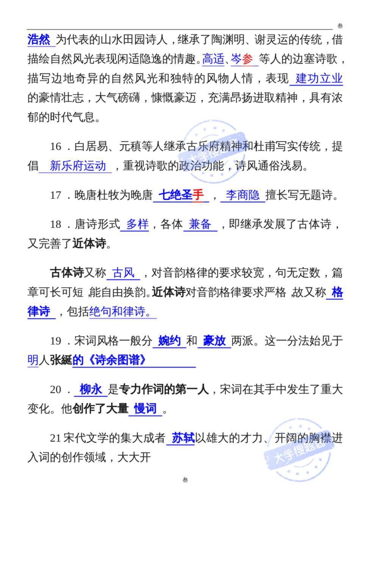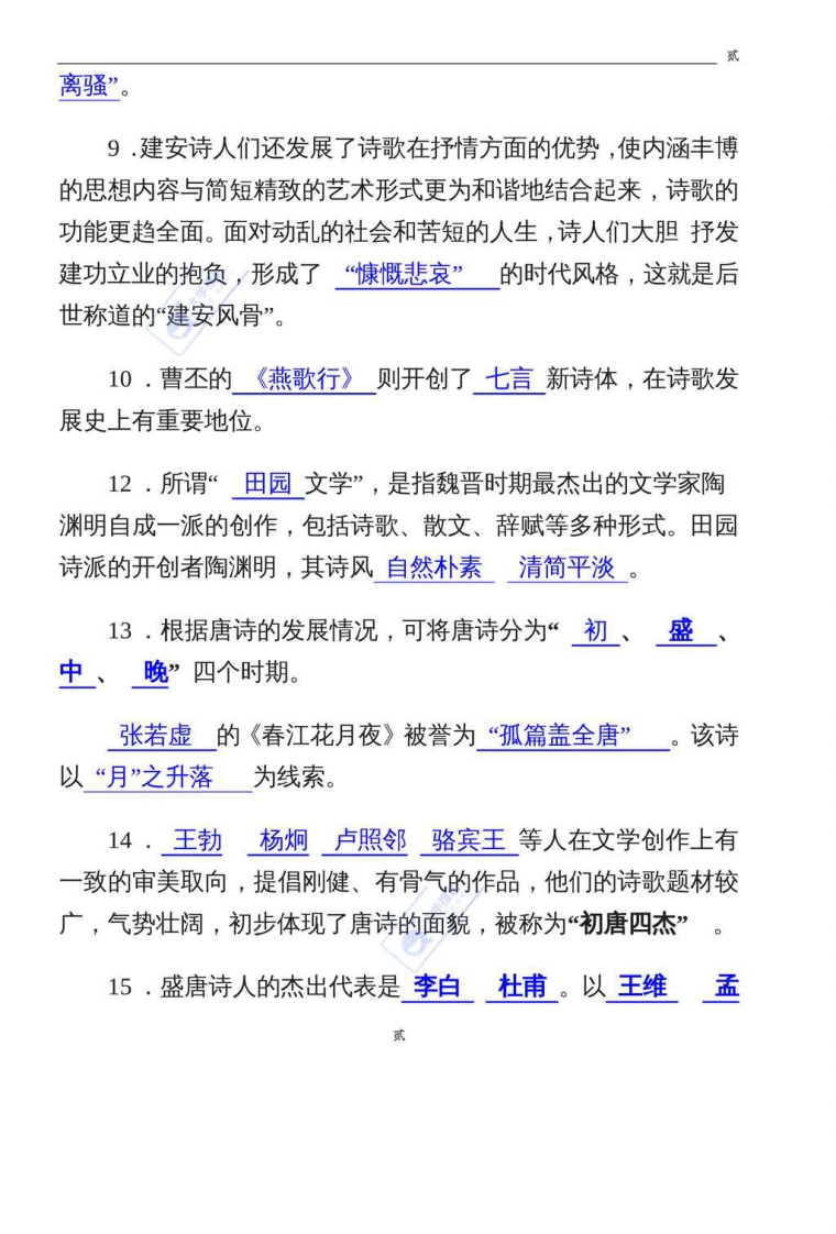 1.《诗经》是我国最早的一部诗歌总集。最初称为《诗》或《诗三百》,由于孔子曾以它为教导学生的教材,汉代学者因之奉为经典,遂称为《诗经》」学搜题2.《诗经》的基本句式是四言,间或杂有二言直至九言的各种句式。《诗经》常常采用叠章的形式。重复的几章间,意义和字面都只有少量改变,造成一唱三叹的效果。这是歌谣的一种特点。3.由屈原开创的楚辞,同《诗经》共同构成中国诗歌乃至中国文学浪漫主义和现实主义两大源头。4·屈原是我国历史上第一位伟大的爱国诗人,首创香草美人的象征性意象。5.《论语》是孔子弟子及后学记录孔子思想、言行的著作。6.《宋史》中有“半部论语治天下”话,强调了《论语》古为今用的巨大功效。7,中国历史散文是中国小说产生的主要源头,这正是中国小说区别于西方小说的一个鲜明的民族特色。8.司马迁《史记》被鲁迅先生誉为“史家之绝唱,无韵之