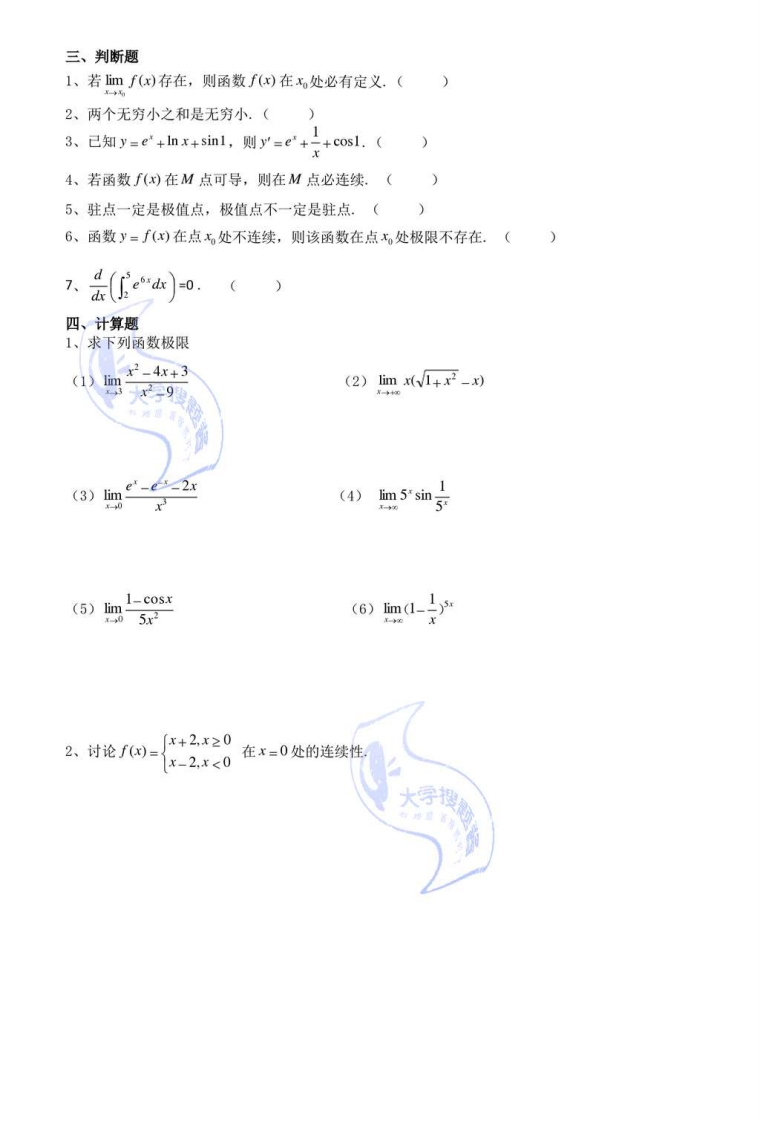 2020-2021第一学期《高等数学》复习题(20级本科)一、选择题1、函数f(x)=log,(x-)的反函数是(d)A.fx)=2+1B.f)=2-1C.fx)=2D.f(x)=22、设fx,)存在,则mf--f2=(。)3hA.-f'(xo)B.f'()c.-If(o)D.033、函数y日x|+3在点x=0处dA、无定义B、可导C、不连续D、连续但不可导4、函数fx)=2x2-x+1在区间L,3引上满足拉格朗日中值定理的:=(·)4、1B、2C、4D、74大字搜题酱5、若函数y=sin2x,则微分d少=(B)A.sin 2x B.2cos2xdx C.cos2xdx D.-2cos2xd6、若[xd(e)=(A.xe*+c B.xe+e+cC.xe*-e*+c D.xe*-e+c二、填空题1、函数f)=r+3+h的定义域为(用区间表示)x-1sinx3x2+2x-12、limlimx++02x2+3凯一小是—装4、当x→o时,函数f)与】是等价无穷小,则m6.x2f(x)sin5x5、函数f(x)=x+0在x=0处连续,则kx=06、一阶导数e山7、在曲线y=nx与直线x=e的交点处,曲线y=nx的切线方程为大学搜题酱