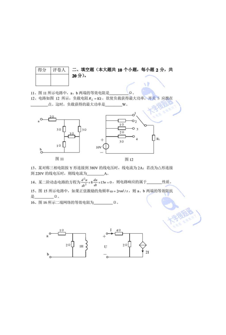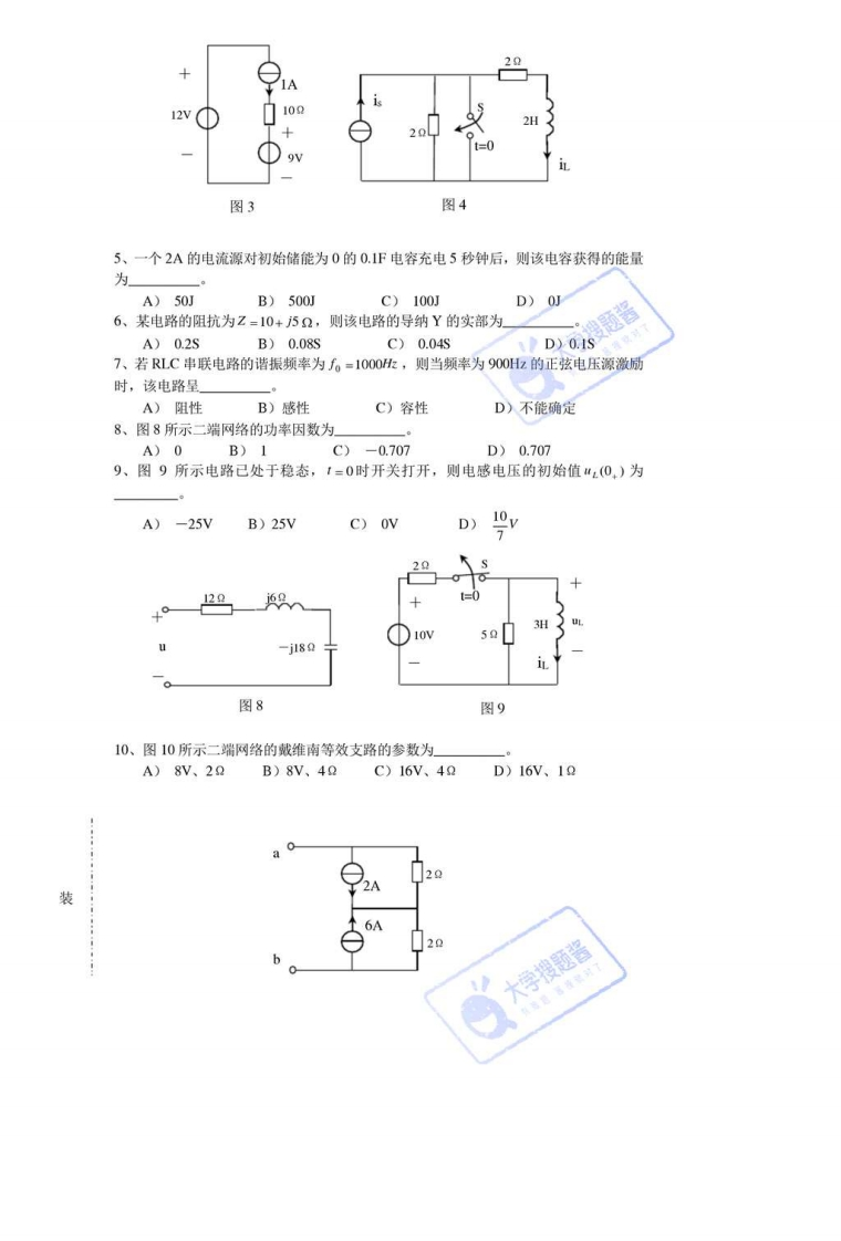 电路分析期末考试试卷及参考答案装考试科目:电路分析》试卷类别:A卷考试时间:120分钟大系级班订姓名学号题号一二三总分分数线得分评卷人一.选择题:本大题共10个小题,每小题2分,共20分,在每小题给出的四个选项中,只有一项是符合题意要求的,把所选项前的字母填在题后的括号内。内1、图1所示电路中,已知电流I=3A,则a、b两端的电压U=A)-10WB)10WC)50VD)-20W2、图2所示电路中,已知元件A放出功率10W,则电流1=请A)IAB)2AC)-1AD)5A1020勿20V10V图1图2答3、电路如图3所示,10电阻吸收的功率为A)IWB)0.9WC)10WD)3W4、图4所示电路原来处于稳态,i,=2©os2:A。1=0时开关闭合,则换路瞬间的电感电流iz(0.)为题A)1AB)0.5AC)cos21AD)2cos21 A大学搜题酱