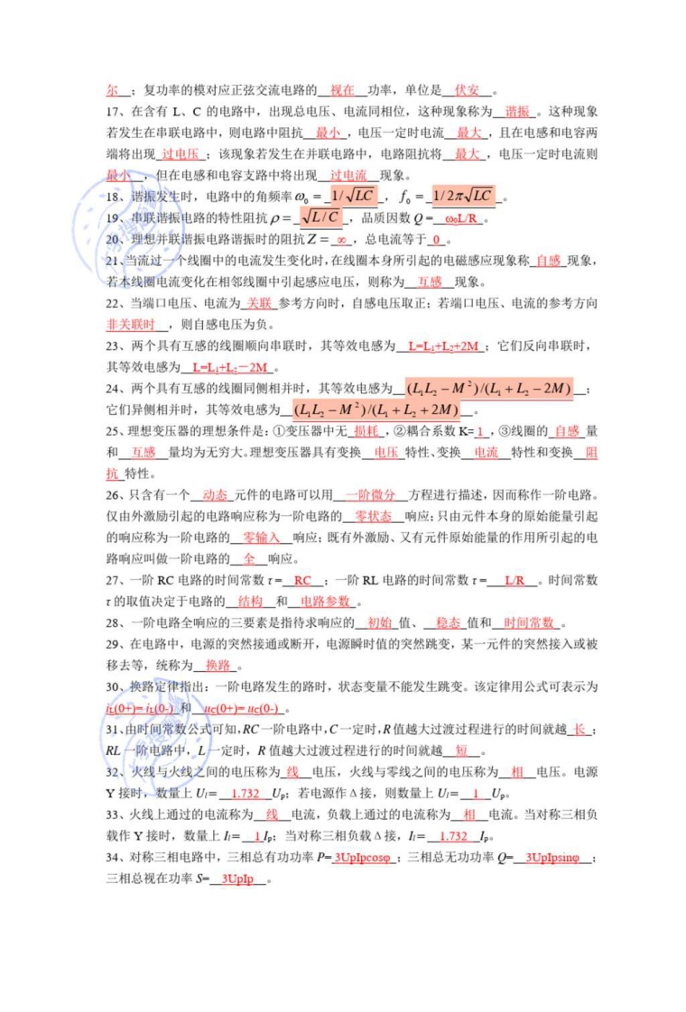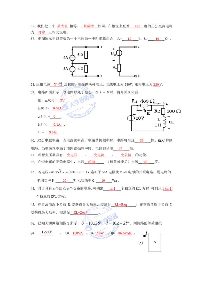 一、填空题1、电阻均为9Ω的△形电阻网络,若等效为Y形网络,各电阻的阻值应为3Q。2、实际电压源模型“20V、1。”等效为电流源模型时,其电流源I,=20A,内阻R,=⊥Ω。3、直流电桥的平衡条件是对臂电阻的乘积相等:负载上获得最大功率的条件是电源内阻等于负载电阻,获得的最大功率P。=U4。-4、如果受控源所在电路没有独立源存在时,它仅仅是一个无源元件,而当它的控制量不为零时,它相当于一个电源。在含有受控源的电路分析中,特别要注意:不能随意把控制量的支路消除掉。5、“等效”是指对端口处等效以外的电路作用效果相同。戴维南等效电路是指一个电阻和一个电压源的串联组合,其中电阻等于原有源二端网络除源后的入端电阻,电压源等于原有源二端网络的开路电压。6、正弦交流电的三要素是指正弦量的最大值、角频率和初相。7、已知一正弦量i=7.07si(314-30)A,则该正弦电流的最大值是7.07A:有效值是5A:角频率是314rd/s:频率是50Hz:周期是0.02s:随时间的变化进程相位是314t30°电角:初相是一30°;合一/6弧度。8、两个同频率正弦量之间的相位之差称为相位差,不同频率的正弦量之间不存在相位差的概念。9、实际应用的电表交流指示值和我们实验的交流测量值,都是交流电的有效值。工程上所说的交流电压、交流电流的数值,通常也都是它们的有效值,此值与交流电最大值的数量关系为:最大值是有效值的1.414倍10、正弦交流电路中,电阻元件上的阻抗一R一,与频率无美:电感元件上的阻抗X,与频率成正比:电容元件上的阻抗-Xc,与频率成反比。1山、单一电阻元件的正弦交流电路中,复阻抗Z=R:单一电感元件的正弦交流电路中,复阻抗Z-X::单一电容元件的正弦交流电路中,复阻抗Z-一Xc:电阻电感相串联的正弦交流电路中,复阻抗Z-R+X:电阻电容相串联的正弦交流电路中,复阻抗Z=R一Xc_:电阻电感电容相串联的正弦交流电路中,复阻抗Z-R+(X一X)。12、单一电阻元件的正弦交流电路中,复导纳Y=G:单一电感元件的正弦交流电路中,复导纳Y=一BL:单一电容元件的正弦交流电路中,复导纳Y=Bc:电阻电感电容相并联的正弦交流电路中,复导纳Y-G+B:一-B)。13、R、L、C串联电路中,电路复阻抗虚部大于零时,电路呈感性:若复阻抗虚部小于零时,电路呈容性:当电路复阻抗的虚部等于零时,电路呈阻性,此时电路中的总电压和电流相量在相位上呈同相关系,称电路发生串联谐振。14、R、L串联电路中,测得电阻两端电压为120V,电感两端电压为160V,则电路总电乐是200V.15、R、L、C并联电路中,测得电阻上通过的电流为3A,电感上通过的电流为8A,电容元一件上通过的电流是4A,总电流是5A,电路呈感性。大16、复功率的实部是有功功率,单位是瓦:复功率的虚部是无功功率,单位是三