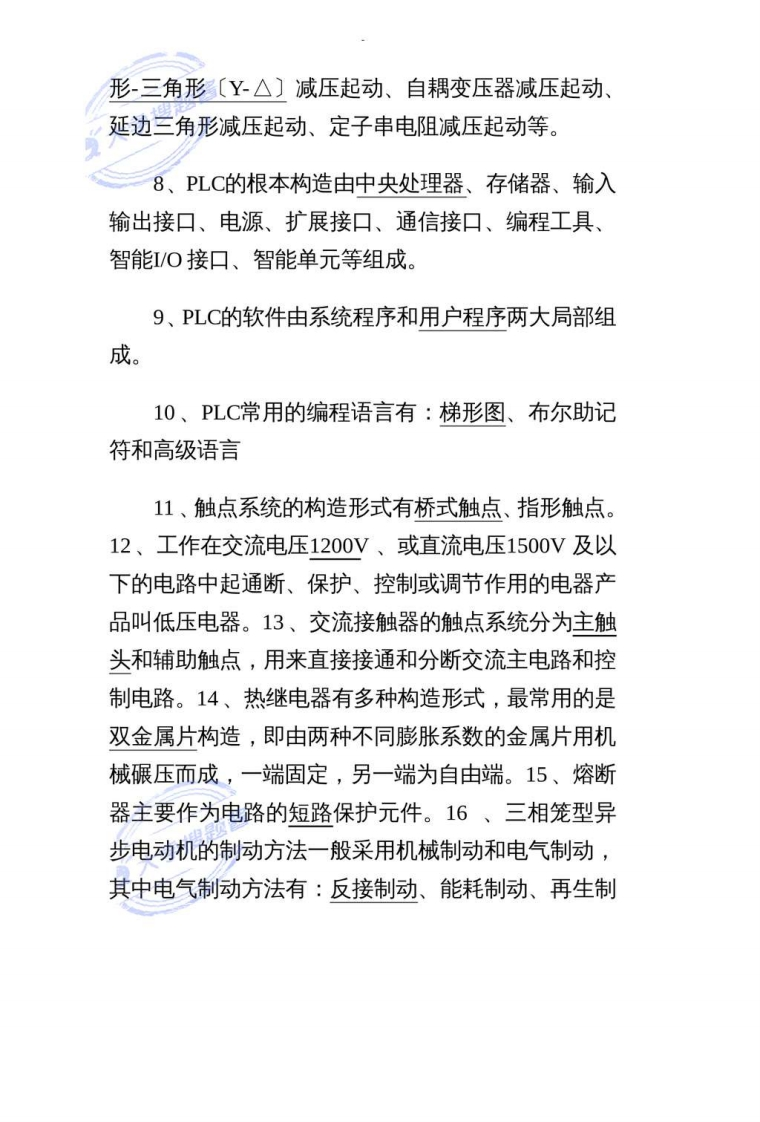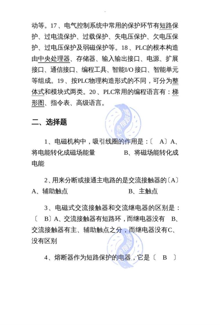 电气控制与PLC期末考试复习题一、填空题1、工作在交流电压1200V、或直流电压1500V及以下的电路中起通断、保护、控制或调节作用的电器产品叫低压电器。2、电磁机构由吸引线圈、铁心、衔铁等几局部组成。3、交流接触器的触点系统分为主触头和辅助触点,用来直接接通和分断交流主电路和控制电路。4、热继电器是利用电流流过发热元件产生热量来使检测元件受热弯曲,从而推动机构动作的一种保护电器,主要被用作电动机的长期过载保护5、熔断器主要由熔体、熔断管〔座)、填料及导电部件等组成。6、各种低压断路器在构造上都有主触头及灭弧装置、脱扣器和操作机构等局部组成。7、三相异步电动机常用的减压起动方式有:星