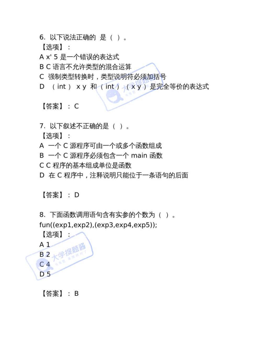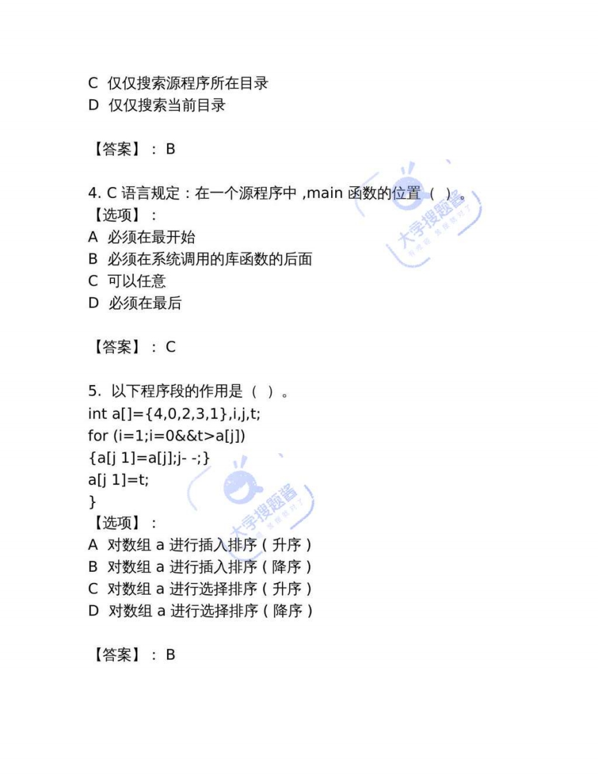 电子科技大学《C语言》20秋期末考试1.若有说明inta[][3]={1,2,3,4,5,6,7};则a数组行数的大小为()。【选项】:A2B3C4D不确定【答案】:B2.若调用一个函数,且此函数中没有return语句,则正确的说法是该函数()。【选项】:A没有返回值B返回若干个系统默认值C返回一个用户所希望的函数值D返回一个不确定的值【答案】:D大学搜尼3.在“文件包含”预处理语句的使用形式中,当#include后面的文件名用"括起时,寻找被包含文件的方式是【选项】:A直接按照系统设定的标准方式搜索目录B先在源程序所在目录搜索,再按照系统设定的标准方式搜索