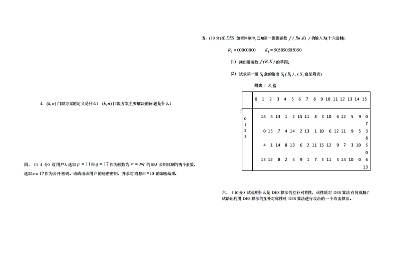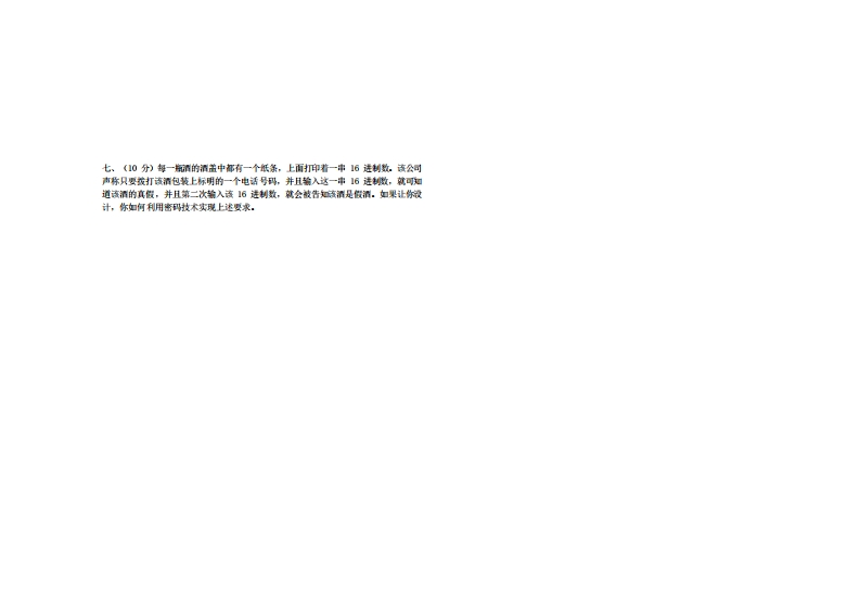 电子科技大学2020-2021学年第二学期工由于密朝线模越大,穷举密明就越因牵,因此密钥烧慎大的密码算法一定要比密钥规模小的密码算法安全。()《现代密码学》课试题&日前对密码体制的攻击设有有效方力法,因此,在应用时可以根据需要任意选拆参数。()专业考试时间年_月日生在同等安全性下,椭围由线密码的密朝长度比照密码的密钥长度要小。()0.不动点攻击对利用区!体制设计的整名算法构成了巨大成粉。题号二三四五六七总分三、简答题(每小题4分,共16分)得分阅委人1。对于模数为124比特的四4公朝体制,如果秘密指数设计为196比特.就可利用公一、填空题(每空2分,共30分)开的如密指数和模数求出该秘密指数,这句话是否正确?为什么?1.Sho通提出的分组密码的两个设计原侧是和2.Ds分组密码的分组长度是比特,有效密钥长度是比特,算法共选代一图。3.一个■序列其最长0等程的长度为9,其周期为一在一个周期内0出现次,1出现_次.4.S公明密码体制的安全性基础是」问题是本解问题,根据当前的计2.在)区分组密码算法:(2)del分组密码算法:()84公钥算法:(4)算水平,盐域数的规模小于或等于比特的区A体制是不安全的,且Gm型公钥密码体制的度全性基础是问题是柔解问题。是非Dfe-Hema密明交换方案:同S场amr(化)门限方案:)DsA数字签名方案:)医.AS算法图属数的字节代替、行移位、列混合和密钥加这4层变换中,线性变换,而其最后一图只有三个变换环节,这样设计的目的是D4柔流函数:这些密码算法中,事些方案会因大合数分解间题的解决而酸破译,事些会因6一个实验共有4个可能结果.这四个可能结果发生的概率分别为0.5,Q.25,Q.25,0.则该为离散对数间题的解决而被破译?实验共包含了_比特的未知信息:当实验完成后,平均孩得了_比特的信息二、判断题(认为对的打√,错的打×,每小题1分,共10分)1.D区分组密码算法中,E盘扩展是雅一的中线性变换。()2.a为圆期内P的m序列,对在意f≠0odP,则g由L(都与序列a平移等价,卫包表示将序列口向左平移t位所得的序列.《)3.怖围由线密码体制的安全性是基于大数分解的因性。()4.在s公明密玛体制中,为了脱密的快速实现,应将脱密密进择的越小越好。(玉.根据当前的计算水平,杂凑两数的长度选择为64比特是安全的。()6S出条凑两数的条凑长度为160比特.3。条凑函数在密码学的主要应用有事些?