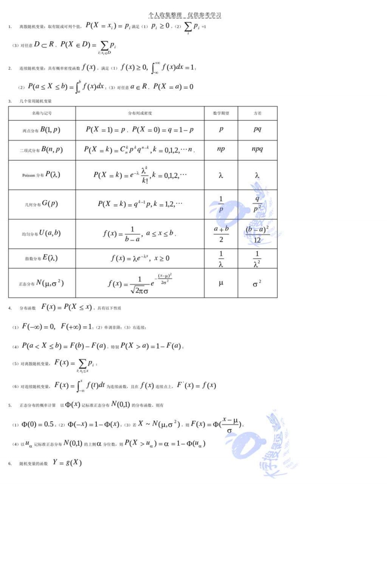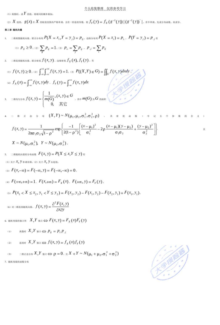 个人收集整理仅供参考学习《概率论与数理统计》复习提要第一原随机率件与展率1.事#的关系ACB AUB AB A-BA2中AB=中2.算规期1DAUB=BUA AB=BA(2(AUB)UC=AU(BUC)(AB)C=A(BC)(3)(AUB)C=(AC)U(BC)(AB)UC=(AUC)(BUC)(AUB=ABAB=AUB3.短率P(A)满足的三条会现及性颜:)0≤P(A)≤12P(2)=1大学搜题酱3对互不相密的作A,A2,,A,有P们A,)=∑P(A)cn时以取0)k=14P)=05P(A)=1-P(A)(6P(A-B)=P(A)-P(AB).ACB.P(B-A)=P(B)-P(A).P(A)
