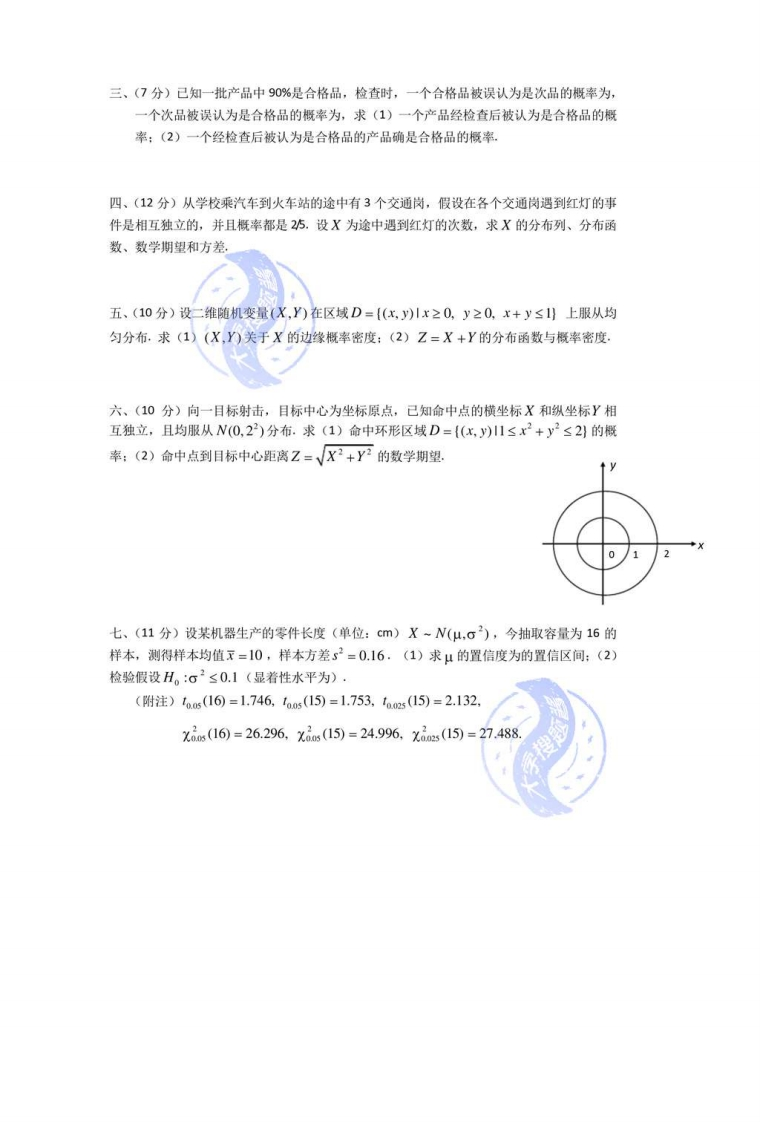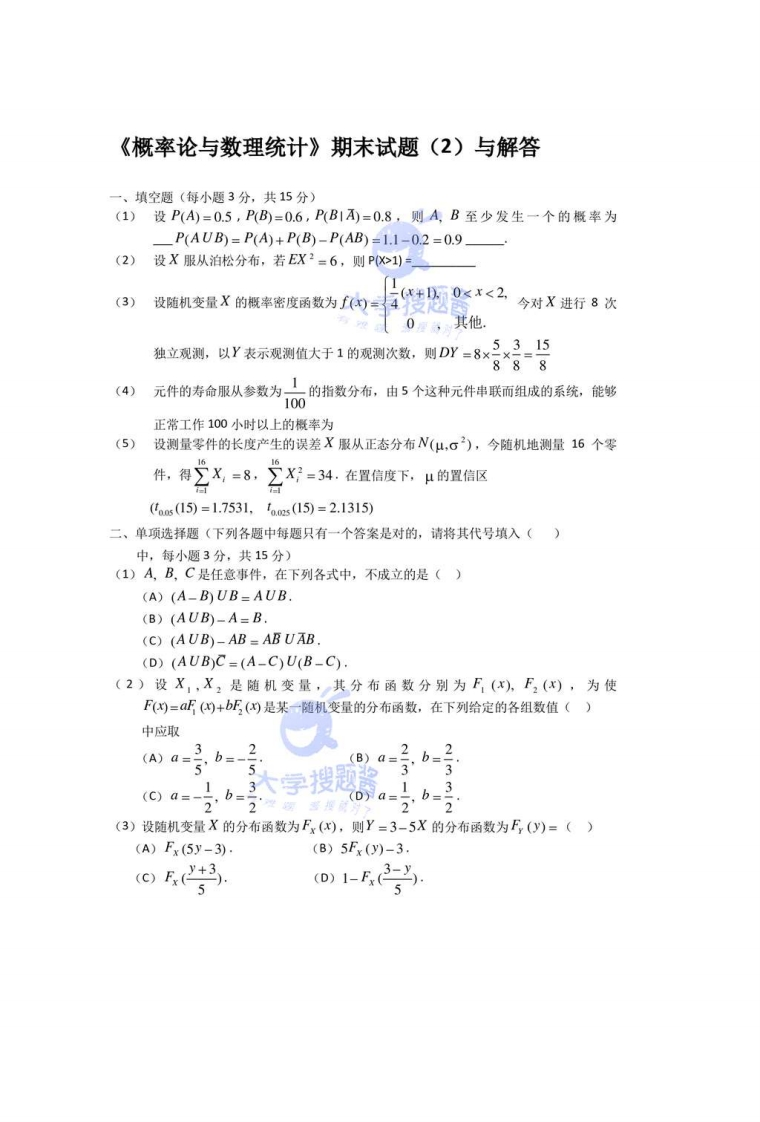 《概率论与数理统计》期末试题(1)一、填空题(每小题3分,共15分)1.设事件A,B仅发生一个的概案为,且P(A)+P(B)=0.5,则A,B至少有一个不发生的概率为2.设随机变量X服从泊松分布,且P(X≤)=4P(X=2),则P(X=3)=3.设随机变量X在区间(0,2)上服从均匀分布,则随机变量Y=X2在区间(0,4)内的概率密度为4.设随机变量X,Y相互独立,且均服从参数为入的指数分布,P(X>)=e2,则入=P(min(X,Y)s1)5.设总体X的概率密度为f(x)=[0+),0-10,其它X,X,A,X.是来自X的样本,则未知参数0的极大似然估计量为二、单项选择题(每小题3分,共15分)1.设A,B.C为三个事件,且A,B相互独立,则以下结论中不正确的是()(A)若P(C)=1,则AC与BC也独立.(B)若P(C)=1,则AUC与B也独立(C)若P(C)=0,则AUC与B也独立(D)若CCB,则A与C也独立,2.设随机变量X~N(O,1),X的分布函数为(x),则P(Xb2)的值为()(A)21-(2](B)2(2)-1.(C)2-(2)(D)1-2Φ(2).3.设随机变量X和Y不相关,则下列结论中正确的是0(A)X与Y独立.(B)D(X-Y)=DX+DY(C)D(X-Y)=DX-DY.(D)D(XY)=DXDY.4.设离散型随机变量X和Y的联合概率分布为(X,Y)1,)(12)(13)(2,1)(2,2)(23)P9183B6若X,Y独立,则a,B的值为021(A)C=(A)a=2B-g9B=91ca6B=。(0)a-is B-s515.设总体X的数学期望为μ,X,X,L,X。为来自X的样本,则下列结论中正确的是0(A)X,是μ的无偏估计量.(B)X,是μ的极大似然估计量。(C)X,是μ的相合(一致)估计量。(D)X,不是μ的估计量.