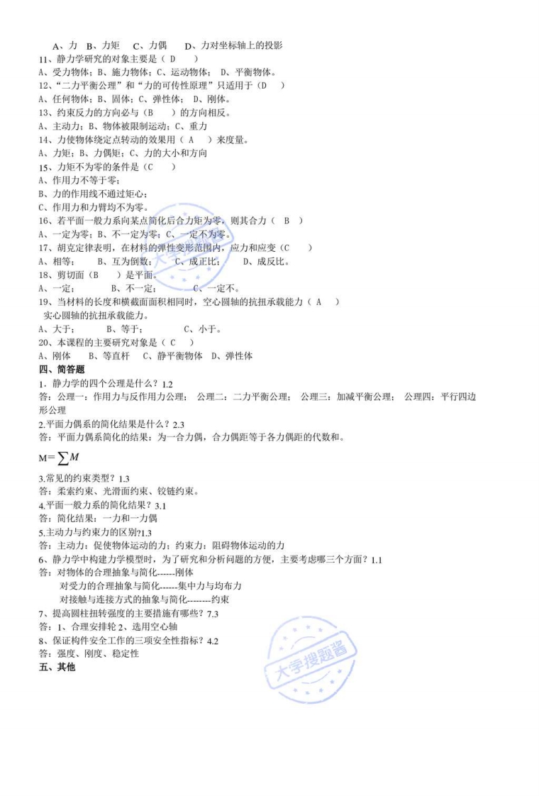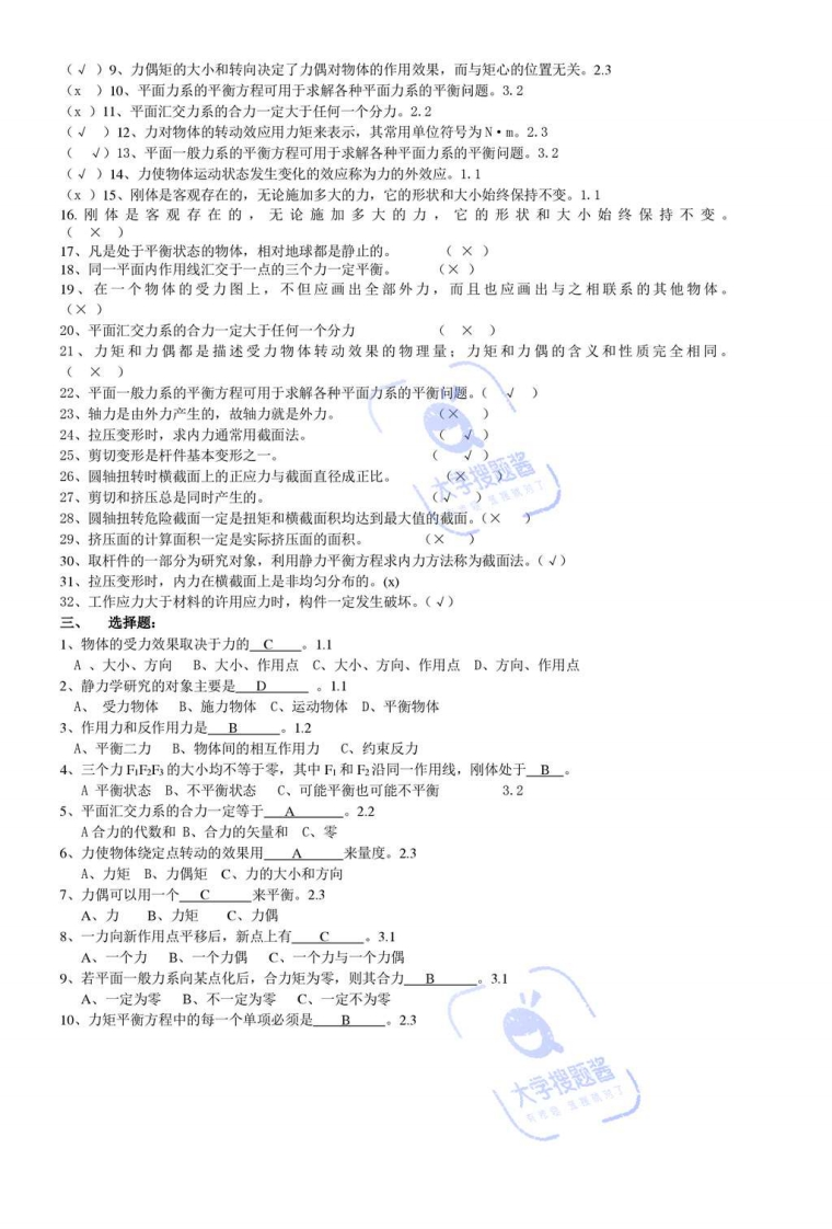 工程力学复习资料一、填空题1、理论力学中的三个组成部分为静力学、运动学和动力学一。绪2、力是物体之间相互的机械一作用、力的作用效应是使物体的运动状态发生改变,也可使物体的形状发生改变。113、力的基本单位名称是生顿,符号是N。1.14、力是矢量量,力的三要素可用带箭头的线段来表示,其长度(按一定比例)表示力的大小一,箭头的指向表示力的方向一·线段的起点或终点表示力的作用点一。115、共线力系是平面汇交力系的特例。2.16、平面力系分为平面汇交力系、平面平行力系和平面一般力系力系。3.17、在力的投影中,若力平行于X轴,则Fx=±F若力平行于y轴,则F±F:若力垂直于X轴,则Fx=0;若力垂直于y轴Fy=0.2.28、作用在物体上各力的作用线都在同一平面,并呈任煮分布沙的力系。称为平面一般力系。3.19、平面一般力系面已知中心点简化后,得到一力和一力偶●。3.110、若力系中的各力作用线在同一平面且相互平行,称平面平行力系,它是平面一般力系的特殊情况。3.211、平衡是指物体相对于地球保持静止或匀速直线运动状态。绪12、对非自由体的运动的限制叫做约束。约束反力的方向与约束所能限制运动方向相反。1.313、作用于物体上的各力作用线都在同一平面,而且汇交的力系,称为平面汇交力系。2.214、力的三要素是力的大小,力的方向,力的作用点15、材料力学中,构件的安全性指标是指:强度,刚度,稳定性。16、力是物体间相互的机越作用,这种作用的效果是使物体的运动状态发生改变,也可使物体的形述发生变化。17、力对物体的作用效果取决于力的大小一、方向和作用点18、欲使作用在刚体上的两个力平衡,其必要与充分条件是两个力的大小相等、方向相反,且作用在一条直线上。19.作用于物体上的各力作用线都在同一平面内内,并且都相较于一点的力系,称为平面汇交力系。20合力在任意一个坐标轴上的投影,等于各分力在同一轴上投影的代数和,此称为合力投影定理。21.平面汇交力系平衡的必要与充分的条件该力系的合力的大小等于零。22力偶对物体的转动效应取决于力偶矩大小、力偶的转向、以及力偶作用面的方位一。23构件的强度是指构件抵抗破坯的能力。构件的刚度是指构件抵抗变形的能力。24.在材料力学中通常采用截面法求内力,应用这种方法求内力可分为截开、代替和平衡三个步骤。25。连接件的失效形式主要包括剪切和挤压破坏。26提高圆轴扭转强度的主要措施是合理安排轮系位置和选用空心轴。27.拉压杆强度条件可用于解决强度校核、选择截面尺寸和确定许可载荷三类问题。28、静力学平衡方程求内力的方法称截面法三个步骤:截开、代替和平衡。29、提高圆柱抗扭强度的主要措施合理安排轮系位置和采用空心轴。73二、判断题(√)1、力使物体运动状态发生变化的效应称为力的外效应。1.1(x)2、刚体是客观存在的,无论施加多大的力,它的形状和大小始终保持不变。1.1(x)3、凡是处于平衡状态的物体,相对于地球都是静止的。1.1(√)4、二力平衡公理、加减平衡力系公理,力的可传性原理只适用行刚体。12《√)7、力系在平面内任意一坐标轴上投影的代数和为等,则该力系一定是平衡力系。22大字货松首(√)5、作用力和反作用力是等值、反向、共线的一对力。12(x)6、平面汇交力系的合力一定大于任何一个力。2.2(√)8、力对物体的转动效果用力矩来定量,其常用单位符号为N.m。23