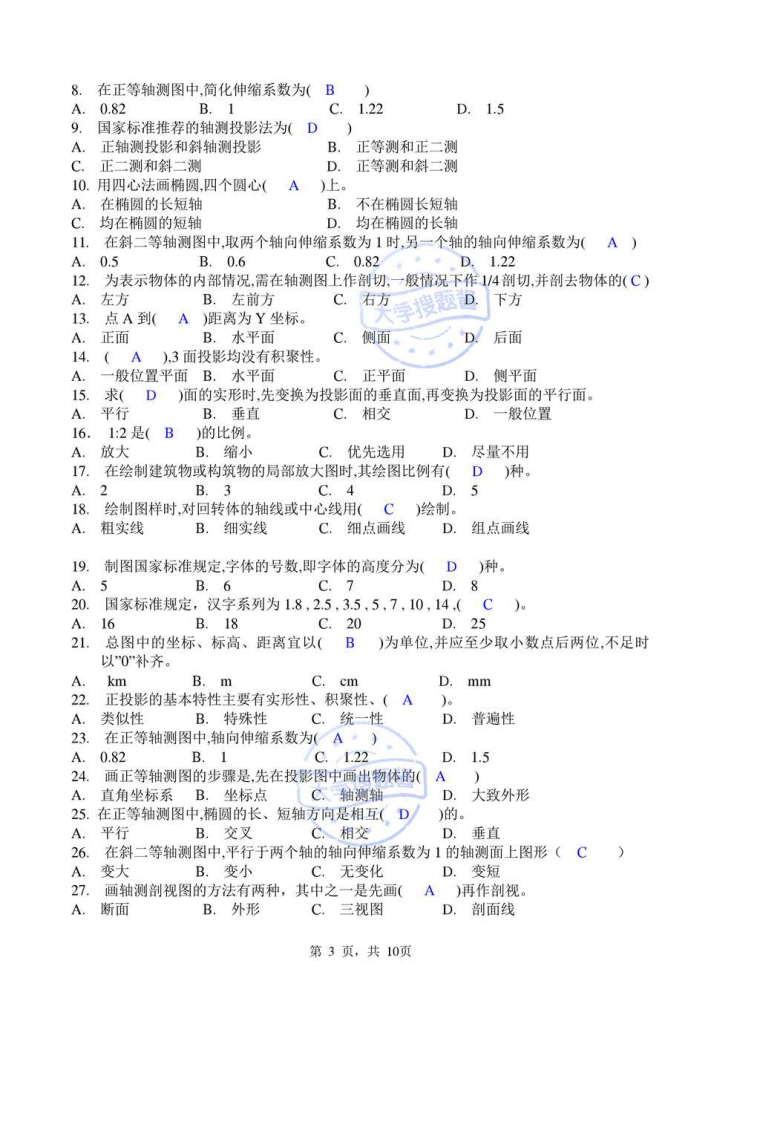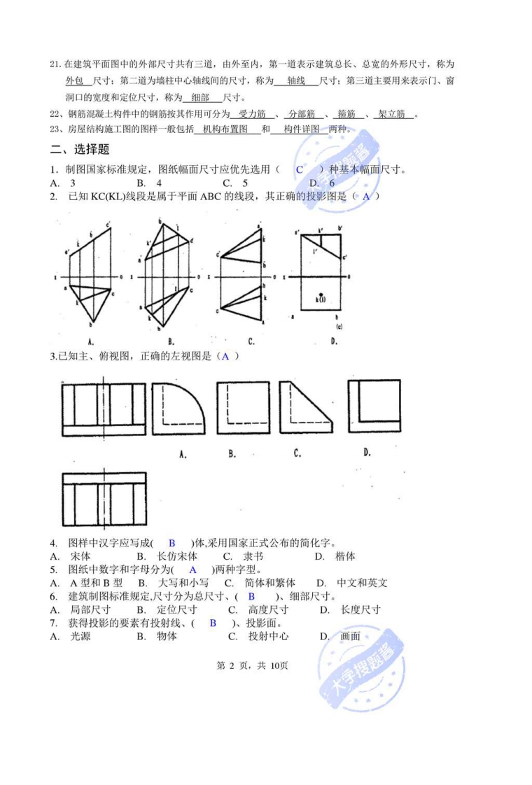 厦门大学网络教育2014-2015学年第一学期《工程制图》课程复习题一、填空题1、尺寸组成的四大要素是尺寸线、尺寸界限、尺寸起止符号和尺寸数字。2、建筑总平面图中标注的尺寸是以M为单位,一般标注到小数点后2位:其它建筑图样(平、立、剖面)中所标注的尺寸则以为单位:标高都以M为单位。3、建筑立面图的命名方法有三种。其中,反映主要出入口或比较显著地反映出房屋外貌特征的那一面的立面图,称为正立面,其余的立面图相应地称为背立面图和侧立面图:还可以按房屋的朝向来命名,如东立面、南立面、北立面和西立面图等:也可以按照轴号来命名。4、建筑形体的两种基本组成方式是叠加和切割一·5、详图的位置和编号,应以详图符号(详图标志)表示。详图符号以粗实线线绘制,直径为14■一。详图与被索引的图样不在同一张图纸内时,用水平直径线将圆分为上下两半,上方分子表示详图的编号,下方分母表示被索引的详图所在图纸编号6、钢筋按其强度和品种分为不同等级,Ⅱ级钢筋的直径符号为史7、写出下列常用结构构件的代号名称:YKB预制预应力空心板、GL过梁8、建筑平面图中,横向定位轴线的编号用阿拉伯数字从左至右依次编写:竖向定位轴线的编号用大写拉丁字母从下至上顺序编写。9、建筑物按其使用功能通常可分为工业建筑、民用建筑、农业建筑及军用建筑。10、剖面图和断面图的区别在于得到的投影,断面图是面的投影,而剖面图是体的投影。11、建筑施工图包括施工总说明、总平面图、平面图、立面图、剖面图、详图。12、立面图中用特粗实线表示地平线,用粗实线表示房屋轮廊线。13、建筑剖面图的剖切位置和剖视方向在首层平面图中表示。14、基础图包括基础布置图和基础大样。15、结构施工图中,圈梁的代号为QL,屋面板的代号为B16、标高有两种,其中绝对标高以青岛附近的黄海平均海平面为零点:相对标高以房屋的室内地坪为零点。标高应以米为单位。17、建筑平面图(除屋顶平面图外)实际上是房屋的水平剖面图,它的剖切位置在门窗洞口上方,用来表示房屋的平面布置情况。桑搜18、结构施工图表达结构设计的内容,它是表示建筑物受力构件的布置、形状、大小、材料、构造及其相互关系的图样。19、房屋施工图由于专业分工的不同,分为建筑施工图、结构施工图和设备施工图。20、为了保护钢筋防锈、防火、防腐蚀,钢筋外边缘至构件表面应留有一定厚度的保护层。第1页,共10页