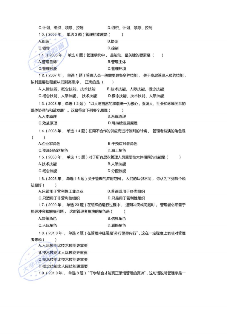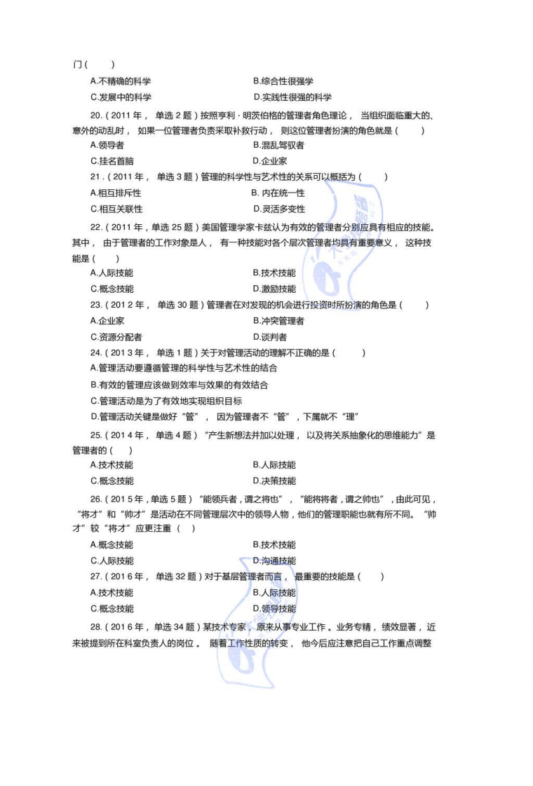 一章管理与管理学一、选择题1,(2001年,单选14题)按照组织系统和层次,以权威和服从为前提,直接指挥下属工作的管理方法是(A.行政方法B法律方法C.经济方法D.思想教育方法2.(2002年,单选7题,2008年,单选3题)管理的核心是()A建立组织机构B.协调人力物力C.协调人际关系D.尽力减少支出3.(2003年,单选2题)管理是一门艺术,这是强调管理的()A有效性B精确性C.复杂性D.实践性4.(2004年,单选1题)技术技能是指运用管理者所监督的专业领域中的过程、惯例、技术和工具的能力。技术技能对于()最重要。A基层管理B.中层管理C.高层管理D.中、高层管理5.(2004年,单选6题)管理的目的是()A获取信息B.协调各方关系C.寻求市场机会D.实现组织目标6.(2005年,单选1题)管理中最重要的问题是(A培养人才,为实现组织目标服务B.充分利用时间、信息资源,完成组织目标C.有效地激励人,挖掘人的内在潜力D充分利用物力、财力,提高经济效益7.(2005年,单选2题)管理的二重性是()A.科学性和艺术性B.自然属性和社会属性C.技术性和人文性D.实践性和艺术性8.(2005年,单选16题)彼得德鲁克说过,如果你理解管理理论,但不具备管理技术和管理工具的应用能力,你还不是一个有效的管理者;反过来,如果你具备管理技术和能力而不具备管理理论,那么充其量你只是一个技术员。这句话说明了(A充分掌握管理理论是成为有效管理者的前提B.管理工作是否有效,不在于是否掌握管理理论C有效的管理者应该既掌握管理理论,又具备管理技术与管理工具的应用能力D,有效的管理者应注意管理技术与工具的应用能力9.(2006年,单选1题)在管理实践中,管理的四项职能一般是顺序履行的,即()A计划、控制、组织、领导B.计划、领导、组织、控制