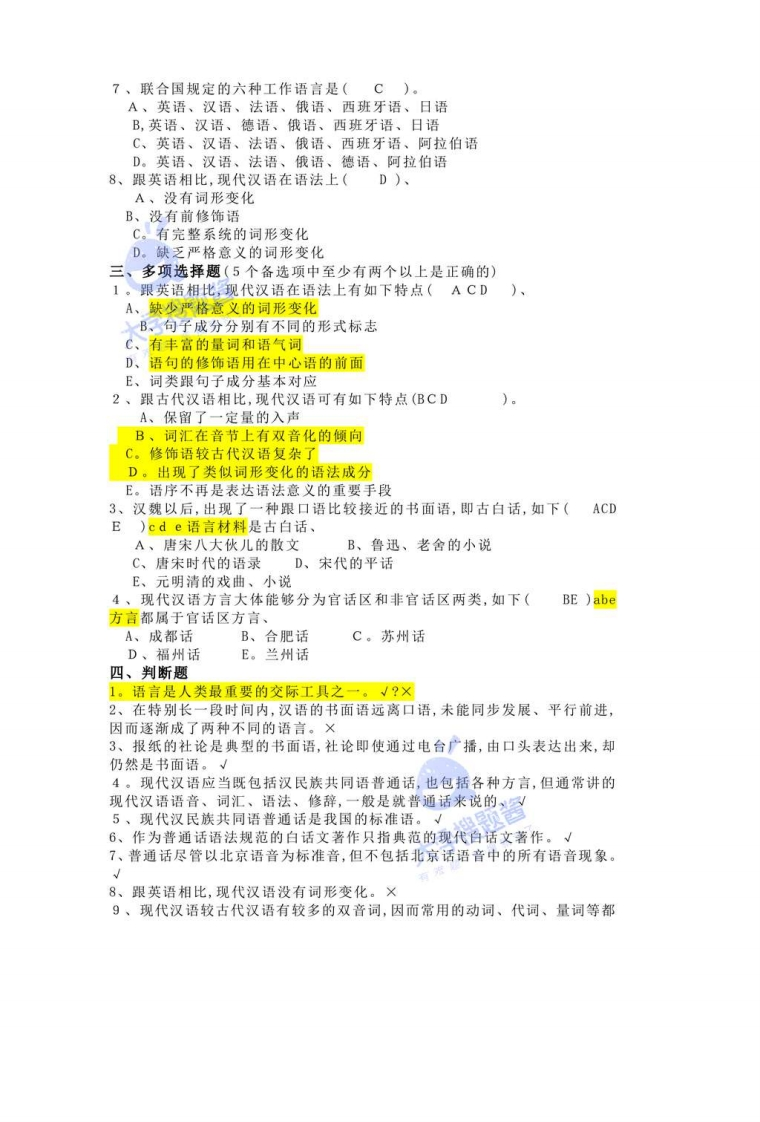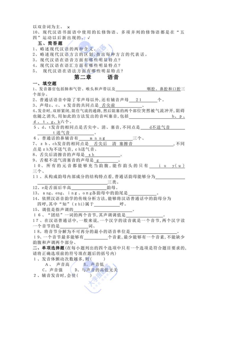 《现代汉语》试题库第一章绪论一、填空题1、广义的现代汉语包括普通话和各种方言2。狭义的现代汉语即现代汉民族共同语,是指以北京语音为标准音、以北方话为基础方言、以典范的现代白话文著作为语法规范的普通适、3、汉语是联合国规定的六种工作语言之一,这六种工作语言分别是汉语、英语、法语、俄语、西班牙语、阿拉伯语。4、跟英语相比,从语法上看,现代汉语的一个基本特点是缺少严格意义的词形变化5、英语和汉语的句子中都能够有修饰语,但两种语言的修饰语的位置不同,英语的修饰语有的在中心语之前,有的在中心语之后,而汉语的修饰语一般在中心语之前6。从方言区划上来看,上海话属于吴方言7、从方言区划上看,南京话属于北方方8、从方言区划上看,广州话属于粤方言9。从方言区划上看,南昌话属于赣方言10、就与普通话的差别来说,各大方言中(闽方言、粤方言)与普通话距离最大。二、单项选择题1、文学家在作品中记录了大量的人物对话,作品中的这些对话属于(A)。A。口语B、书面语C、白话D、书面口语2。报纸上的社论是典型的书面语,而社论通过广播电视播出后,(B)。A、就成了口语B、却仍然是书面语C。介于口语和书面语之间D。口语风格的书面语3。从汉语发展史上看,汉语的口语和书面语是(a。A、同步发展,平行前进的B、两种不同的语言体系C、没有什么大的差别的D、长期分离的4。下列方言就其与普通话的差别来说,(b)。A、客家话与普通话的距离最大B、闽语与普通话的距离最大C、吴语与普通话的距离最大D、湘语与普通话的距离最大5、现代汉语语音在音节上(A)。A、没有复辅音B、辅音只出现在音节的开头C、辅音只出现在音节的末尾D、开头和末尾都必须有辅音6、现代汉语词汇在音节上(D)、A、以单音节词为主B。以三音节词为主C。以四字格为主D、有双音节化的倾向