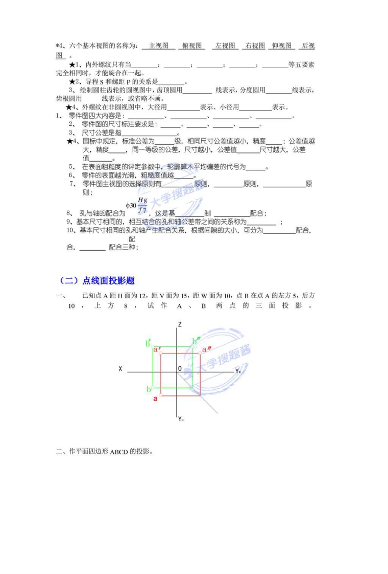 (一)填空题1、机械制图中通常采用两种线宽,粗、细线的比率为2:1,可见轮廓线采用线,尺寸线,尺寸界线采用线,轴线,中心线采用2、在三面投影体系中,主视图,俯视图,左视图之间保持的原则3、螺纹的基本要素有五个:螺纹要素全部相同的内、外螺纹方能连接。4、基本尺寸相同的,相互结合的孔和轴公差带之间的关系称为配合。配合代号由孔的公差带代号与轴的公差带代号组成。标注配合公差代号时分子表示分母表示5、50F7h6采用的是50H7/m6是6、M68X2表示,公称直径为68mm的普通细牙螺纹,M为,2为一。7、Φ36H8表示:中36是,H8是,其中,H是,8是1、画平面图形时,应先画其次画最后画2、选择公差等级总的原则是:在满足的条件下,尽量选取等级。3、图样上标注的尺寸是物体的尺寸,单位是图形比例为1:5表示的是5倍.4、组合体的视图上一般应标注出和三种尺寸。度量尺寸的起点称为5、配合的种类有6、根据投射方向与轴测投影面的相对位置,轴测图分为和7、组合体上相邻两表面的连接关系可分为三种情况。1.比例1:2是比例,若实物长度和图纸上的长度相等,则采用比例2.三视图的投影关系是:主、俯视图长对正,主、左视图,俯、左视图3.直线在其垂直的投影面上投影为一点,直线在其平行的投影面上投影反映该直线的,若直线倾斜于投影面,其投影还是直线,但长度比实际长度:4.一对齿轮啮合的条件是:等:1.机械制图中通常采用两种线宽,粗、细线的比率为2:1,可见轮廓线采用线,尺寸线,尺寸界线采用线,轴线,中心线采用1、机械制图当中基本图幅有哪五种A0A1A2A3A4其中A4图纸幅的尺寸为210×2972、机械制图当中常用的线型有粗实线、细实线、虚线等,可见轮廓线采用粗实