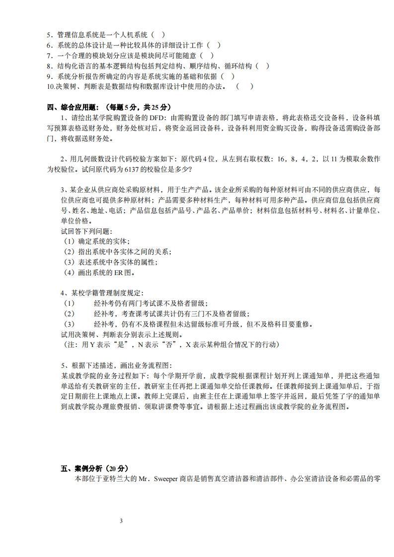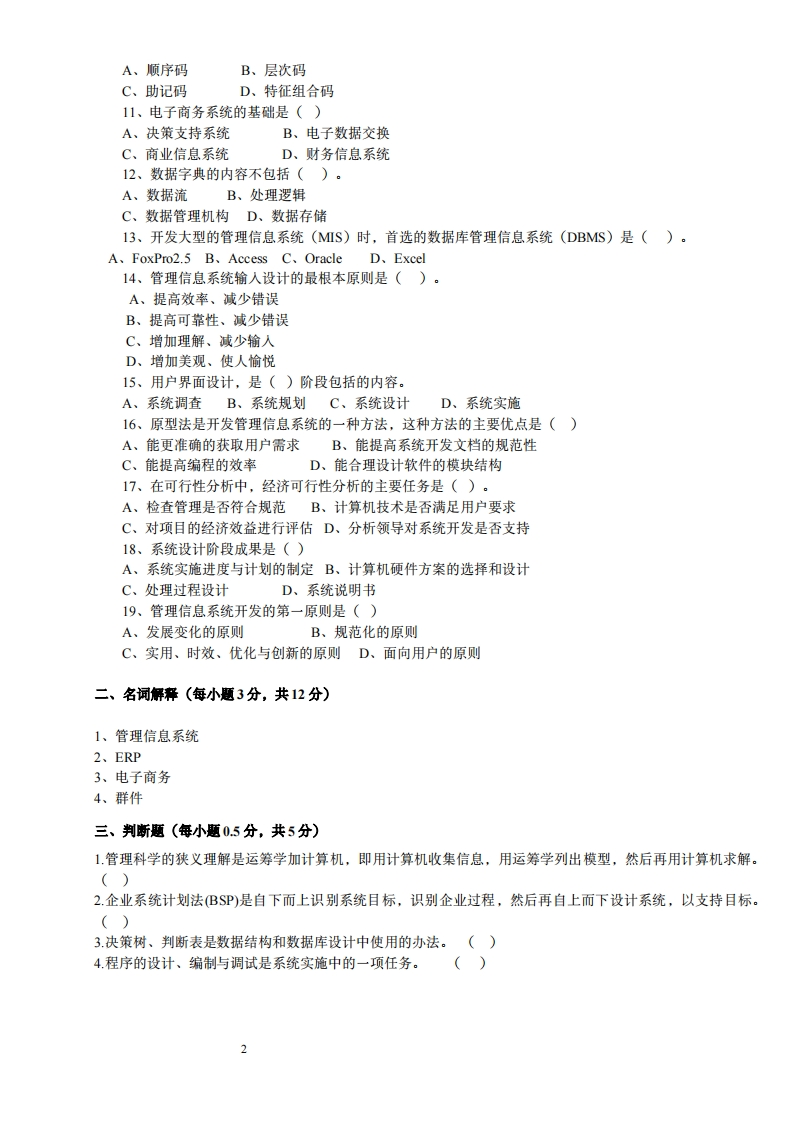 河北工业大学2019-2020学年度第一学期期末考试《管理信息系统》试题命题人:审核人:题号三四总分分数阅卷教师签字:一、单项选择题:(每小题2分,共38分)1、用于管理系统规划的方法很多,把企业战略目标转化为信息系统战略目标的方法属于()A、U/C矩阵法B、关键成功因素法(CSF)C、战略目标集转化法D、企业系统规划法(BSP)2、诺兰模型把信息系统的发展过程归纳为六个阶段。其中,可以满足个管理层次需求,真正实现信息资源管理系统的阶段是()。A、蔓延阶段B、集成阶段C、控制阶段D、成熟阶段3、系统分析的主要目的是()A、提出新系统的逻辑方案B、提出总体目标C、提出实施方案D、提出运行方案4、系统分析报告的主要作用是()。A、系统规划的依据B、系统实施的依据C、系统设计的依据D、系统评价的依据5、决策支持系统中完成决策功能的核心部分是()A、数据库子系统B、模型库子系统C、方法库子系统D、人机对话子系统6、下列描述中不属于信息特征的是()A、客观性B、价值性C、系统性D、时效性7、一个管理信息系统的好坏主要是看它()A、硬件先进、软件齐全B、是否适合组织的目标C、是否投资力量最省D、是否使用计算机网络8、计算机的网络安全是指()A、网络中设备设置环境的安全B、网络使用者的安全C、网络可共享资源的安全D、网络的财产安全9、在MIS系统实施过程中程序设计的主要依据是()。A、数据流程图B、系统流程图C、程序设计说明书D、决策表与决策树10、某高校学生学号规定如下,前2位表示年级,中间三位表示院系专业,后3位表示顺序号。例如05161010表示2005年入学,工商管理学院信息专业第10名注册,这种代码属于()7