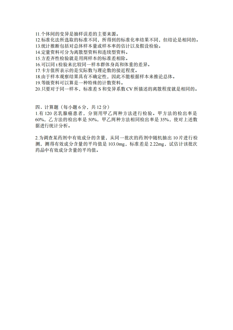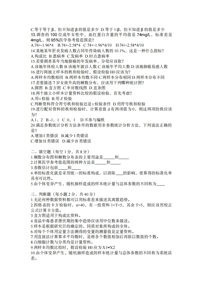 河北工业大学20212022学年第一学期《管理统计学》期末试卷(A)院(系)班级学号姓名题号六八九十总分得分一、单项选择题(每小题2分,共40分)守装1.若想比较3岁男孩和25岁成年男性体重的变异程度,应该使用下列哪项指标?订A.四分位数间距B.标准差C.均数D.变异系数规线2.下列变量中属于连续变量的是?则内A患病人数B.挂号人数C.出生人数D.白细胞个数诚不3.满足对数正态分布的资料应该如何进行检验。考要A直接做u检验B.直接做t检验C.做t'检验D.取对数后做t检验试容4两样本均数比较时,分别取以下检验水准,哪项所取的第二类错误概率最小?绝题A.a=0.05B.a=0.01C.a=0.1D.a=0.25要统计甲、乙单位某种职业病的患病率,若用工龄为标准进行率的标准化,应弊该如何进行?A以甲单位工人工龄为标准B.以乙单位工人工龄为标准C.以甲乙单位工人的合并年龄为标准D以甲乙单位工人的合并工龄为标准6.对于总体合计数=500的5个样本率的资料做卡方检验时,其自由度是?A499B.496C.4D.17.进行卡方检验时,有P1,P2,P3三个样本率作比较,分别是π1,π2,π3。下列说法中正确的是?记不清选项了TAT.8.若要描述某医院住院病人病种的构成,应该用下列哪种统计图来表示?A直条图B.线图C.圆图D.散点图R9.概率P的取值范围是?A.(-1,1)B.(0,1)C.(0,+o)D.[0,1]10.医学统计工作的四大步骤是?A设计,搜集资料,整理资料,分析资料B.设计,审查资料,整理资料,描述资料C设计,搜集资料,描述资料,分析资料D设计,审查资料。描述资料,分析资料11.区间X+-2.58SX-的含义是?A.99%的总体均数在此范围内B.样本均数的99%的可信区间C.99%的样本均数在此范围内D.总体均数的99%的可信区间12.进行正态性检验时,a=0.01,若得出的结论是符合正态分布,但发现该结论是错误的,则犯错误的概率是多少?A.大于0.1B.等于0.1