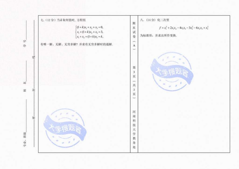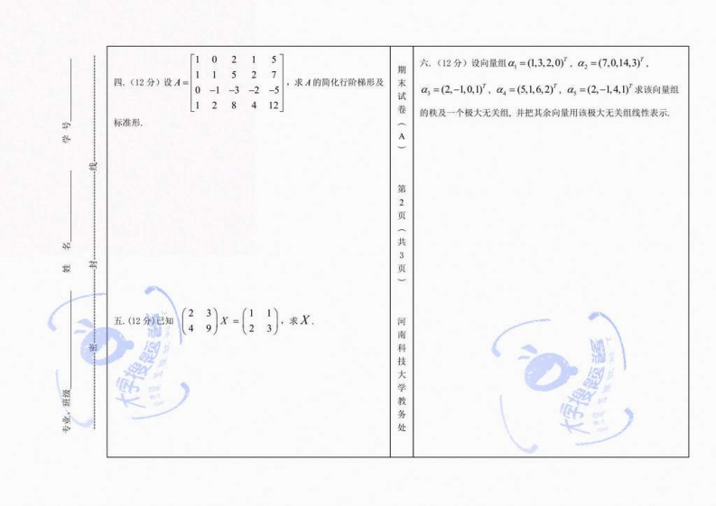 河南科技大学A.IB.3C.2D.2期2020至2021学年第二学期期末试卷3.设4阶方库A是的秩为2,则(A)=课程年级、专业试A.0B.1C.2D.4题号二四五七九总分[anap +kay「10k1A4得分4.设A=B=P=010an axa」00填空想(每空3分,共15分)-k71.设A=(123),B=(4,5,6),则AB=第0其中A间逆,则B=01002.设A为二阶方降且A与-2,则-A日项3.设向量组A:%=(0,-1kG=(山k,-1了,a=(-11,k)了,共A.APB.PAC.AP3搜酱且R(0=2.则k=01就对[10.005.设矩阵A=41-2则中位于第二行第三列的元素是4.设A=001与A=01相似,则a-101010A.-2B.2C.-3D.35.设3阶方降A的特征值为1,35,则A厂-22-40二.单项选择题(每小题3分,共15分】南三。(8分)计算D=4-1351-2-31.设A和B为n阶方阵,且(A+B(A-B)=A2-B2则必有,技205A.A■BB.AB=BAC.A=ED.B=E学2.设向量组a,=(1,3,6,2),a=(2,12,-1,a=0,-1,a-2,的秩为2,则a=处