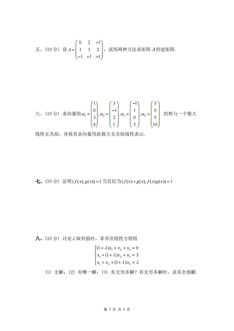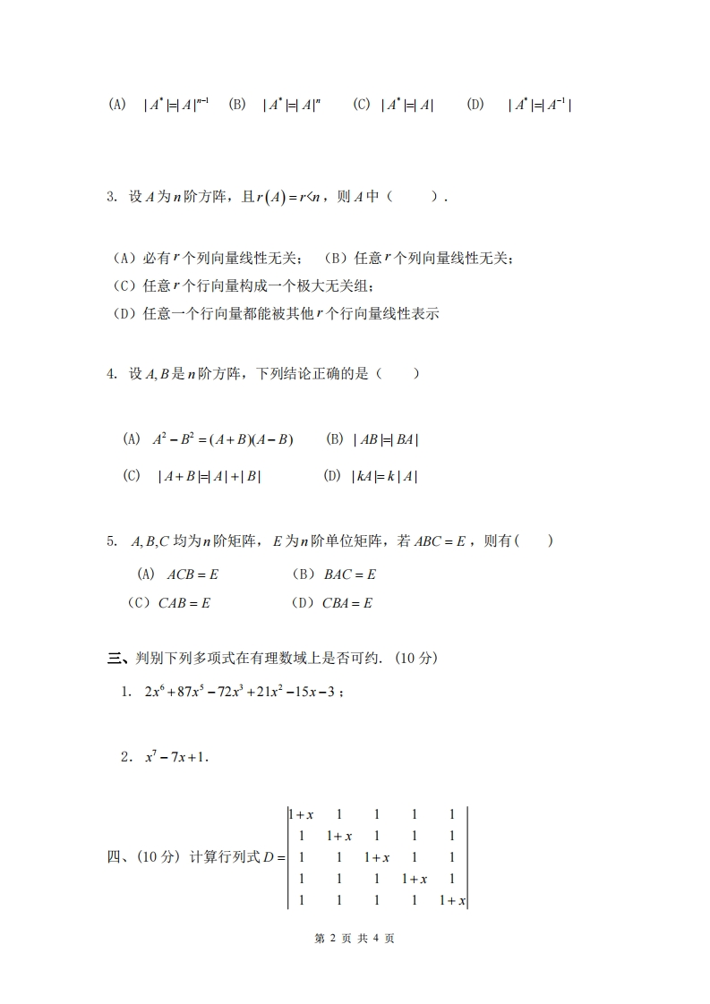 华东师范大学期末试卷2021一2022学年第一学期高等代数与解析几何期末试卷本试卷共4页:考试时间120分钟:任课教师;出卷时间年月学院专业年级班学号姓名得分】一、填空题(15分)a b cd1.设四阶行列式D=az b2 c d,A表示行列式D的第i行第j列元素的代as bs csdas ba cs d数余子式,则A1+A1+A1+A1=2设4为3阶矩阵,且4非分则-4日3.设a1=(1,2,3),42=(3,-1,2),4=(2,3,),若a,a2,4线性相关,则t=4.若A为n级实对称阵,并且AA=O,则A=则X=二、选择题(15分)1.设(x-1)2KAx+Bx2+),则A,B=()(A)12(B)-1,2(C)-1,2(D)1,-22.设A为n阶矩阵,A是A的伴随矩阵,则有()成立第1页共4页