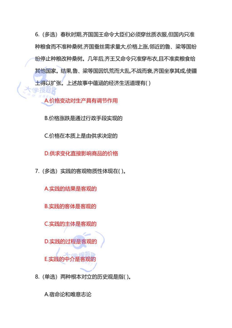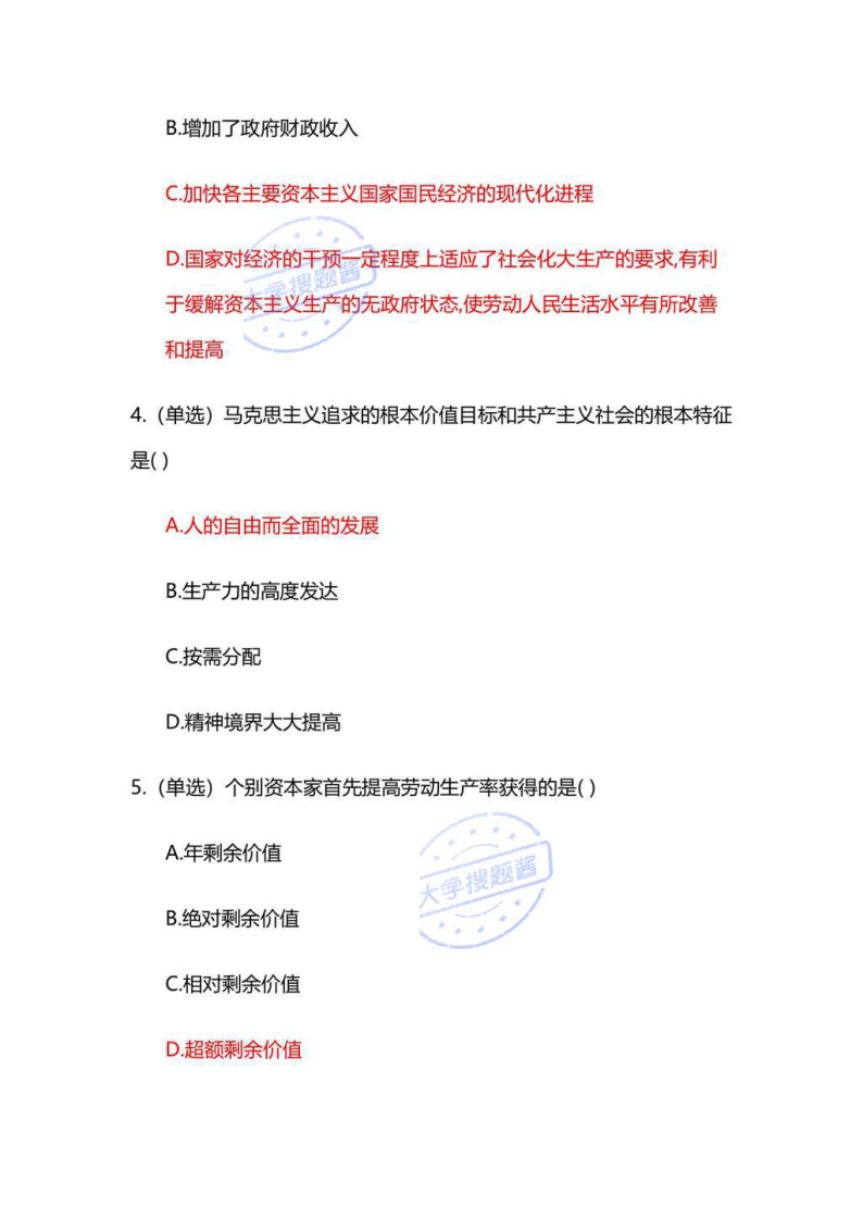 上海外国语大学2020-2021学年第一学期期末选择题《马克思主义基本原理》大学搜题选择题(每题1分,共100分)1.(单选)经济基础是指()。A.社会中占统治地位的生产关系的总和B.由一定的生产力所决定的生产关系C经济基础和上层建筑的总和D.在社会中占支配地位的生产关系2.(单选)生产力是指人们()。A.改造和影响自然的能力B.解决生产发展问题的能力C掌握和运用知识的能力大学搜题酱D.改造客观世界的能力3.(多选)国家垄断资本主义的积极作用()。A.在一定程度上有利于社会生产力的发展