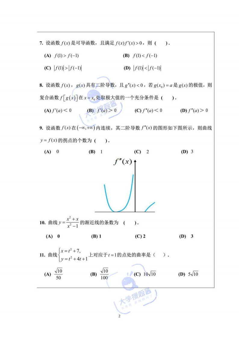 武汉理工大学《高等数学(A上)》2020-2021学年第一学期期末试卷A卷猴哥6个月前更新关注私信0.34MB5页01.2W+5553武汉理工大学《高等数学(A上)》2020-2021学年第一学期期末试卷A卷此内容为付费资源,请付费后查看10积分年度会员免费月享会员免费登录购买付费资源已售 786 第1页 / 共5页 第2页 / 共5页 第3页 / 共5页 试读已结束,还剩2页,您可下载完整版后进行离线阅读 © 版权声明文章版权归作者所有,未经允许请勿转载。THE END《武汉理工大学》期中期末历年真题期末试卷 文本预览 武汉理工大学考试试卷(A卷)2020~2021学年1学期高等数学A(上)】课程闭卷时间120分钟,72学时,5学分,总分100分,占总评成绩%2021年1月5日题号二三四五七八九十合计满分454015100试卷装订线得分如选择题(115小题,每小题3分,满分45分)製1.设lima,=a≠0,则当n充分大时,必有()用◆就e2(a>a-(D)d, 查看更多 收起部分 喜欢就支持一下吧点赞5553赞赏 分享QQ空间微博QQ好友海报分享复制链接收藏 猴哥关注 04.7W+0281270W+ 分享各类学习考试资料,欢迎关注我。 北京理工大学-睿信书院-《复变函数与积分变换》2018-2019学年期末试卷B卷北京理工大学-睿信书院-《复变函数与积分变换》2018-2019学年期末试...6个月前 2.3W+北京理工大学《计算机基础》2018-2019学年期末试卷北京理工大学《计算机基础》2018-2019学年期末试卷6个月前 2.3W+北京理工大学《高等数学》2019-2020学年期末试卷北京理工大学《高等数学》2019-2020学年期末试卷6个月前 2.3W+北京理工大学数据结构期末试卷北京理工大学数据结构期末试卷6个月前 2.3W+北京理工大学《计算机基础》2017-2018学年期末试卷北京理工大学《计算机基础》2017-2018学年期末试卷6个月前 2.3W+北京理工大学-睿信书院-《复变函数与积分变换》2016-2017学年期末试卷A卷北京理工大学-睿信书院-《复变函数与积分变换》2016-2017学年期末试...6个月前 2.3W+ 上一篇 武汉大学《无机化学A》2008-2009(上)化学类I、Ⅱ班期末试卷 下一篇 西北大学《大学计算机》2023-2024学年第一学期期末试卷 相关推荐 北京理工大学-睿信书院-《复变函数与积分变换》2018-2019学年期末试卷B卷北京理工大学-睿信书院-《复变函数与积分变换》2018-2019学年期末试卷B卷6个月前 2.3W+北京理工大学《计算机基础》2018-2019学年期末试卷北京理工大学《计算机基础》2018-2019学年期末试卷6个月前 2.3W+北京理工大学《高等数学》2019-2020学年期末试卷北京理工大学《高等数学》2019-2020学年期末试卷6个月前 2.3W+北京理工大学数据结构期末试卷北京理工大学数据结构期末试卷6个月前 2.3W+北京理工大学《计算机基础》2017-2018学年期末试卷北京理工大学《计算机基础》2017-2018学年期末试卷6个月前 2.3W+北京理工大学-睿信书院-《复变函数与积分变换》2016-2017学年期末试卷A卷北京理工大学-睿信书院-《复变函数与积分变换》2016-2017学年期末试卷A卷6个月前 2.3W+ 评论 抢沙发 请登录后发表评论 登录 注册 暂无评论内容