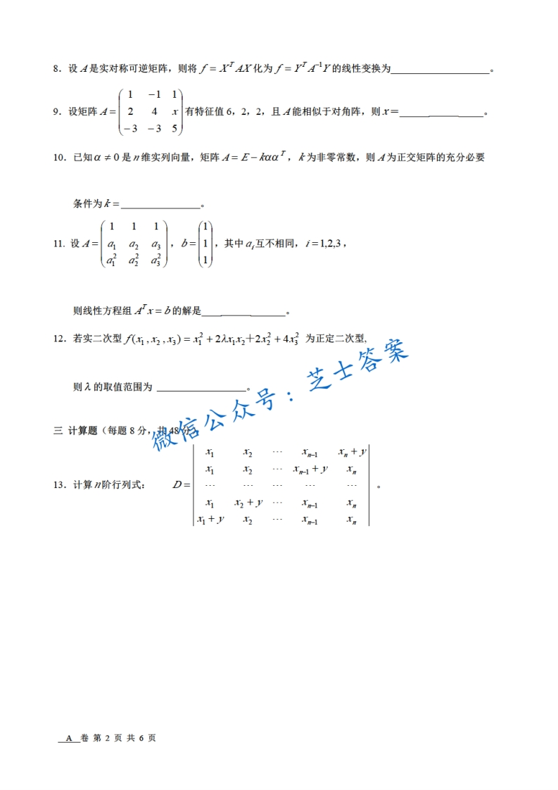 上海交通大学《线性代数》2007-2008学年第一学期期末试卷A卷猴哥6个月前发布关注私信0.86MB8页03822上海交通大学《线性代数》2007-2008学年第一学期期末试卷A卷此内容为付费资源,请付费后查看10积分年度会员免费月享会员免费登录购买付费资源已售 40 第1页 / 共8页 第2页 / 共8页 第3页 / 共8页 试读已结束,还剩5页,您可下载完整版后进行离线阅读 © 版权声明文章版权归作者所有,未经允许请勿转载。THE END《上海交通大学》期中期末历年真题期末试卷 喜欢就支持一下吧点赞22赞赏 分享QQ空间微博QQ好友海报分享复制链接收藏