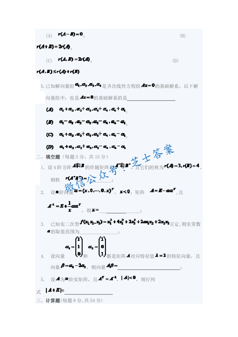 上海交通大学《线性代数》2004-2005学年第一学期期末试卷猴哥6个月前发布关注私信0.47MB4页03835上海交通大学《线性代数》2004-2005学年第一学期期末试卷此内容为付费资源,请付费后查看10积分年度会员免费月享会员免费登录购买付费资源已售 40 第1页 / 共4页 第2页 / 共4页 第3页 / 共4页 试读已结束,还剩1页,您可下载完整版后进行离线阅读 © 版权声明文章版权归作者所有,未经允许请勿转载。THE END《上海交通大学》期中期末历年真题期末试卷 喜欢就支持一下吧点赞35赞赏 分享QQ空间微博QQ好友海报分享复制链接收藏